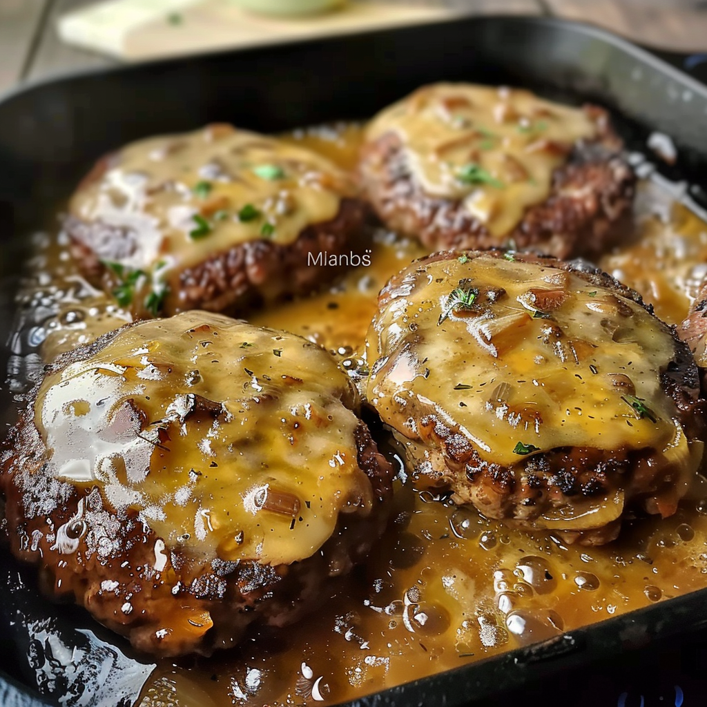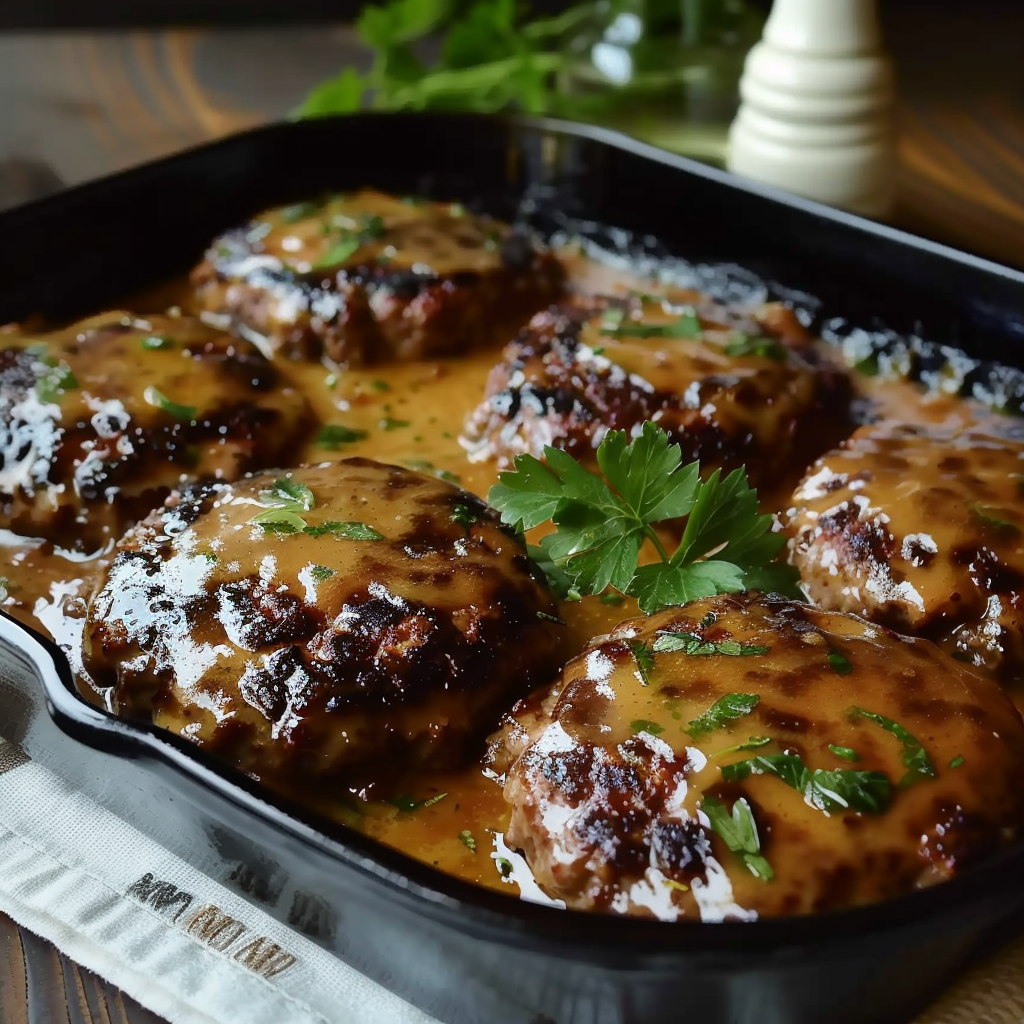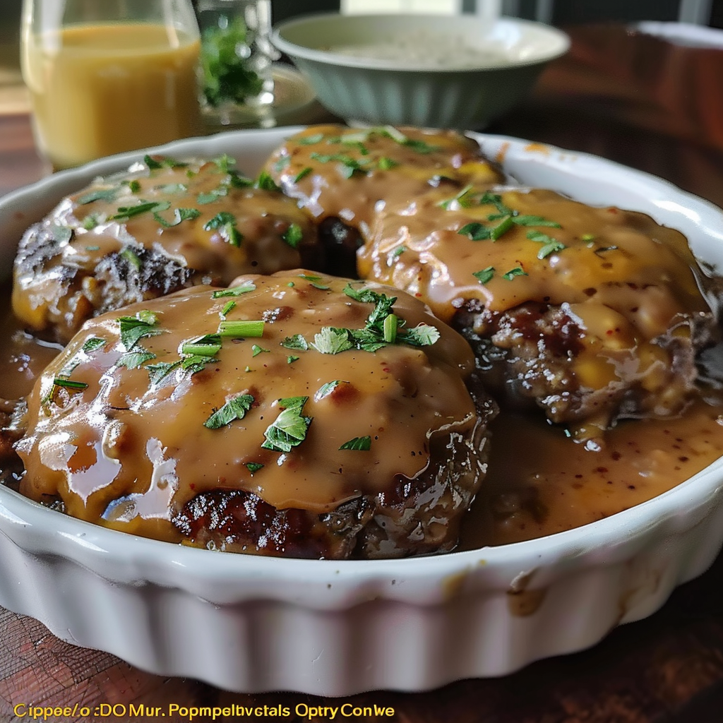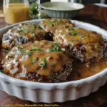The creamy mushroom gravy is another defining element. Using a can of cream of mushroom soup combined with milk and Worcestershire sauce, the gravy infuses the meat with a savory, umami-rich base. The sauce thickens beautifully as it bakes, coating the hamburger steaks and eliminating the need for stovetop prep. It’s the kind of recipe that’s ideal for families or busy home cooks who want a budget-friendly dinner that doesn’t skimp on flavor.