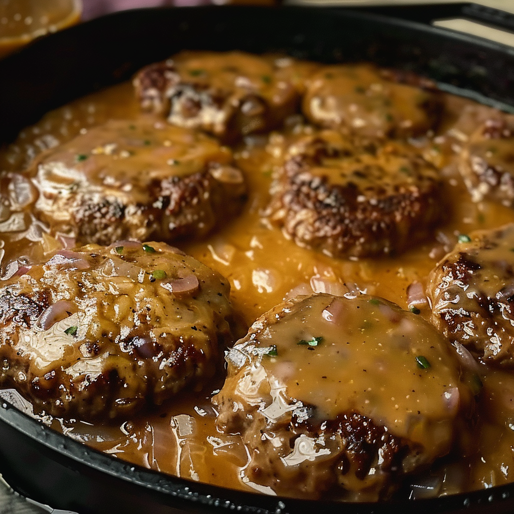 Freeze cooked patties and gravy in freezer-safe containers for up to 2 months. Thaw in the fridge overnight before reheating.