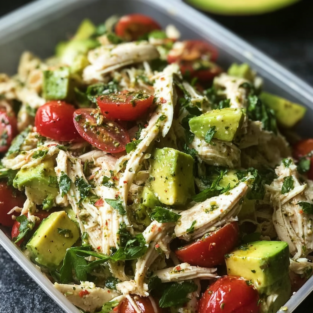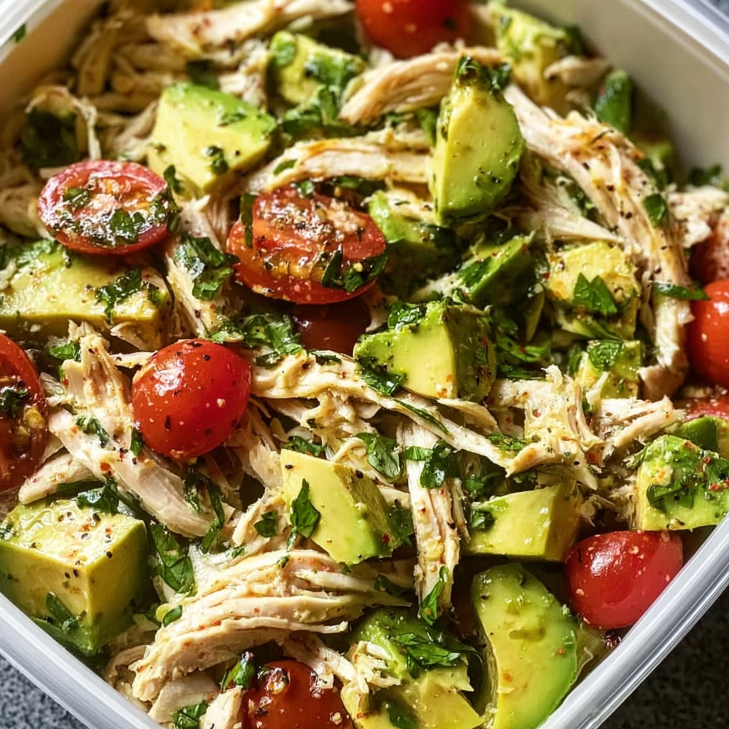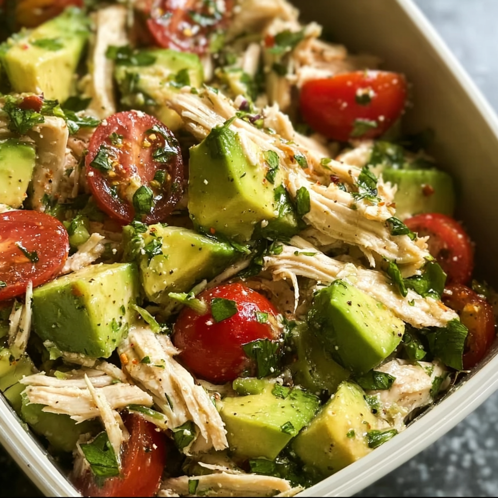 A creamy, healthy chicken salad made with ripe avocados, fresh vegetables, and simple seasonings—perfect for a quick and nutritious meal.