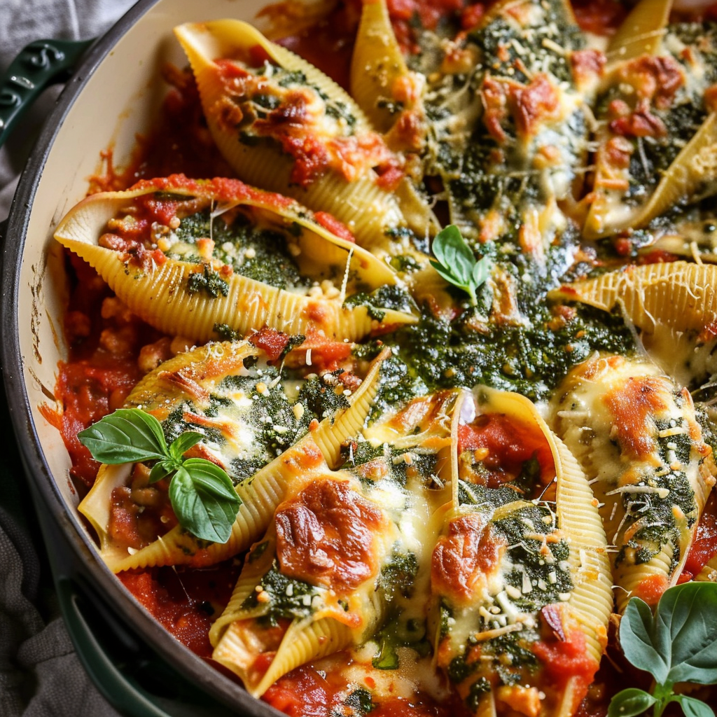 Baked stuffed shells are a timeless comfort food, and this version elevates the classic with rich layers of flavor and texture. The tender jumbo shells act as perfect vessels for a cheesy, creamy filling, creating a dish that feels indulgent yet nourishing. The combination of three cheeses—ricotta, mozzarella, and Parmesan—ensures that each bite is melty, savory, and deeply satisfying. Meanwhile, the addition of spinach provides a fresh, earthy note and balances the richness of the cheeses.