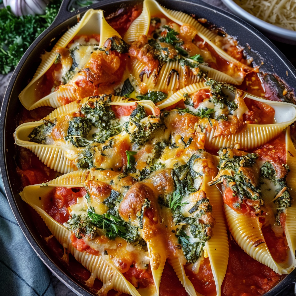 Baked Stuffed Shells with Creamy Tomato Sauce & Herb Pesto is the kind of comforting, cheesy, and vibrant dish that makes any dinner feel like a celebration. This recipe brings together tender jumbo pasta shells filled with a savory mixture of ricotta, spinach, and Parmesan, all nestled in a rich, creamy tomato sauce and topped with a vibrant swirl of fresh herb pesto. It’s everything you want in a baked pasta—hearty, flavorful, and surprisingly easy to prepare.