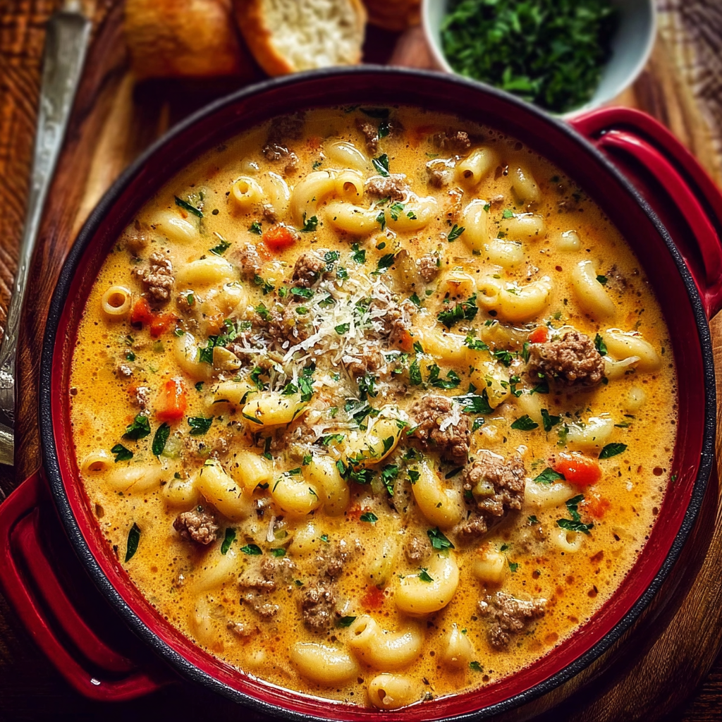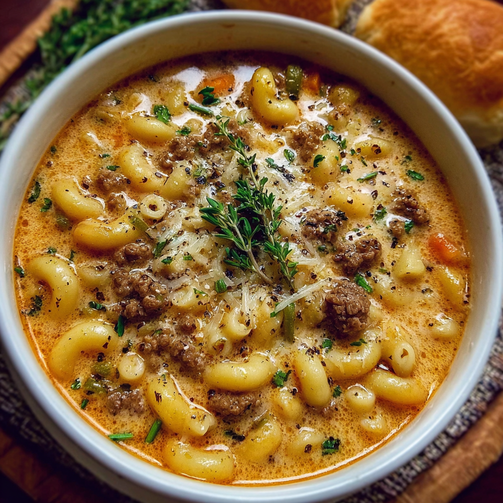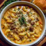 This dish combines the childhood joy of mac and cheese with the satisfying depth of a beef-based soup. Ground beef is browned and simmered with broth, pasta, and a rich blend of cheeses to create a thick, velvety soup that’s spoon-worthy and filling. The one-pot method simplifies cleanup and allows the pasta to absorb all the savory flavors as it cooks directly in the broth and beef.