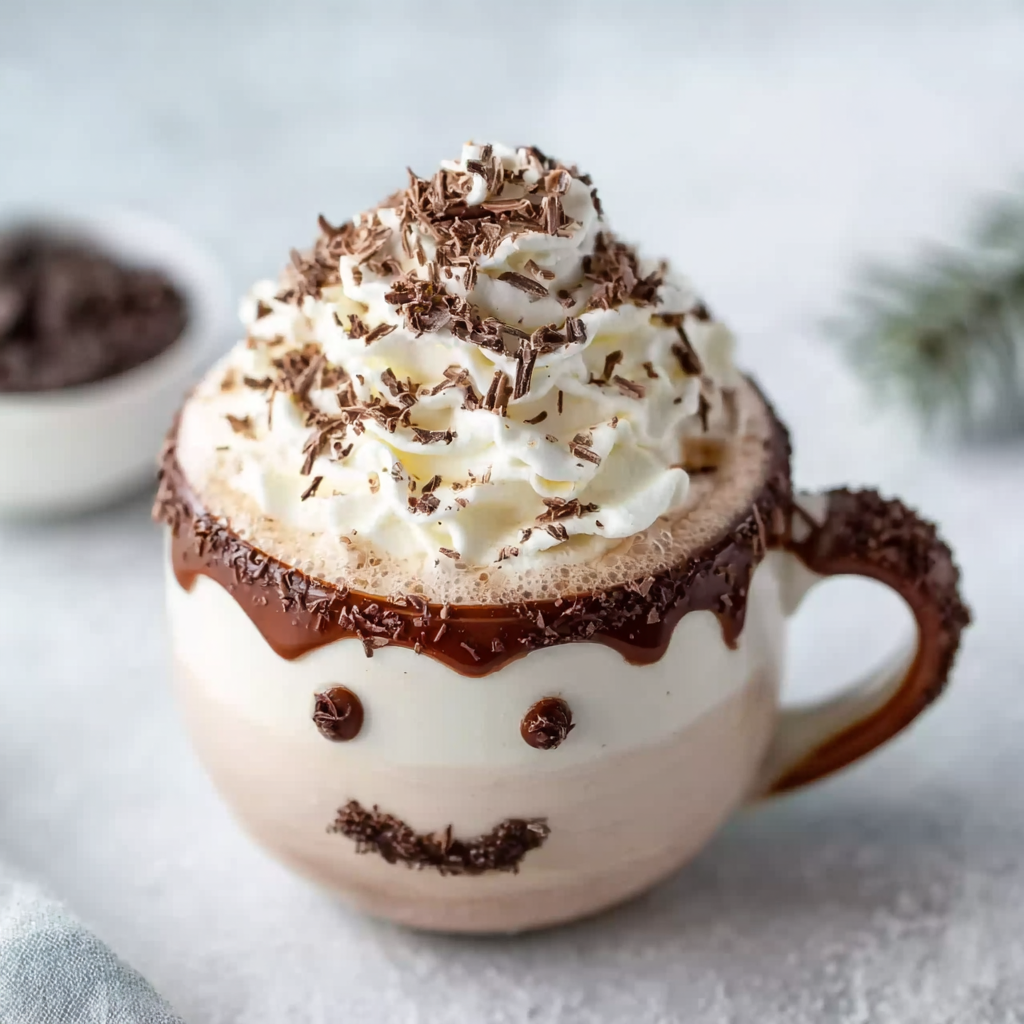 The charm of this winter drink lies in its presentation. The beverage itself is creamy and snowy white, resembling freshly fallen snow. On top sits a playful garnish made to resemble a miniature snowman, typically crafted with marshmallows.