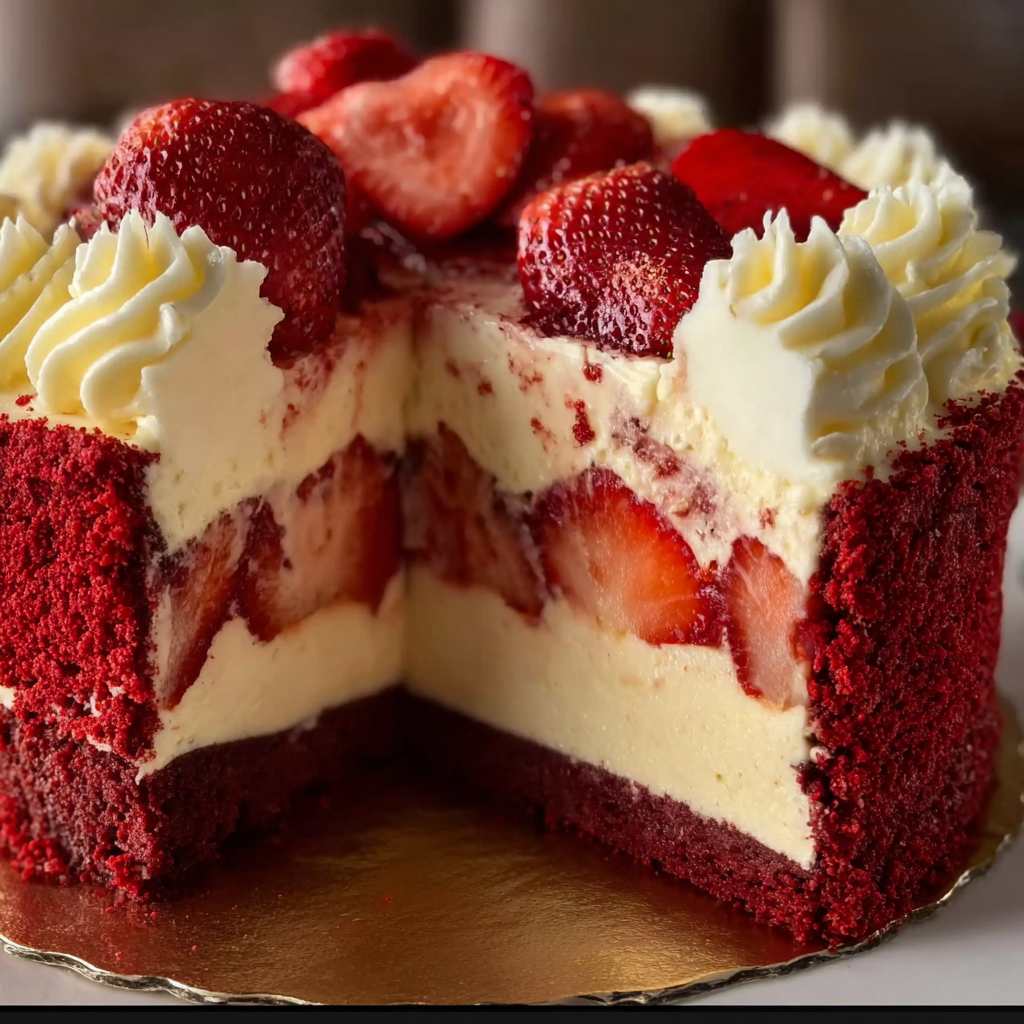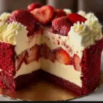 Red Velvet Strawberry Cheesecake is more than just a dessert—it’s an experience. From the moment you slice into its striking layers to the first bite of creamy cheesecake paired with moist red velvet cake, this dessert captures attention and satisfies every sweet craving. It combines elegance with comfort, making it suitable for both casual family dinners and grand celebrations. What makes this recipe truly special is its balance. The red velvet layer provides structure and a subtle cocoa undertone. The cheesecake filling delivers luxurious creaminess without being overwhelming. The strawberry topping brightens each bite with natural fruit flavor and a glossy finish that elevates the entire presentation. This is the kind of dessert that sparks conversation around the table. Guests will ask for the recipe. Photos will be taken. Seconds will be requested. And best of all, it’s a recipe you can confidently recreate for years to come. Whether you’re baking for a special occasion or simply because you love decadent desserts, this Red Velvet Strawberry Cheesecake is guaranteed to impress. Once you try it, it may just become your signature showstopper. PrintBest Red Velvet Strawberry Cheesecake – Decadent Layered Dessert