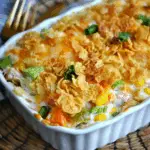 Sprinkle this mixture evenly over the casserole, then top with the remaining ½ cup of shredded cheddar cheese.