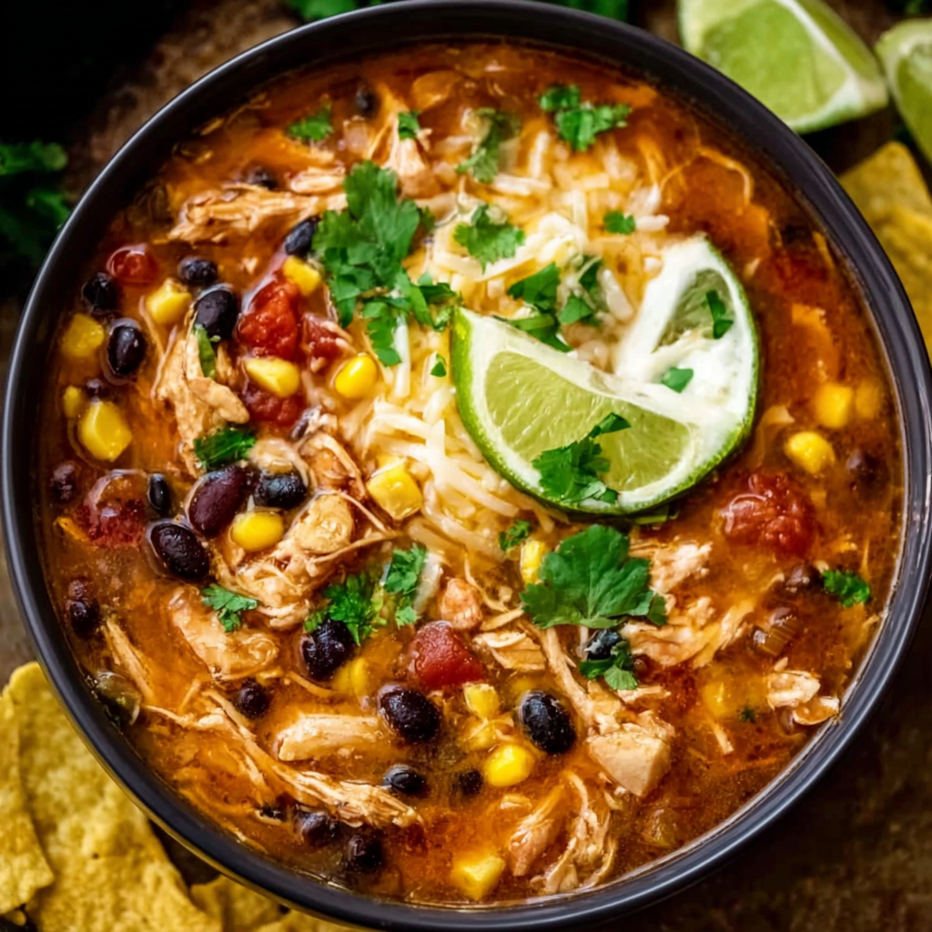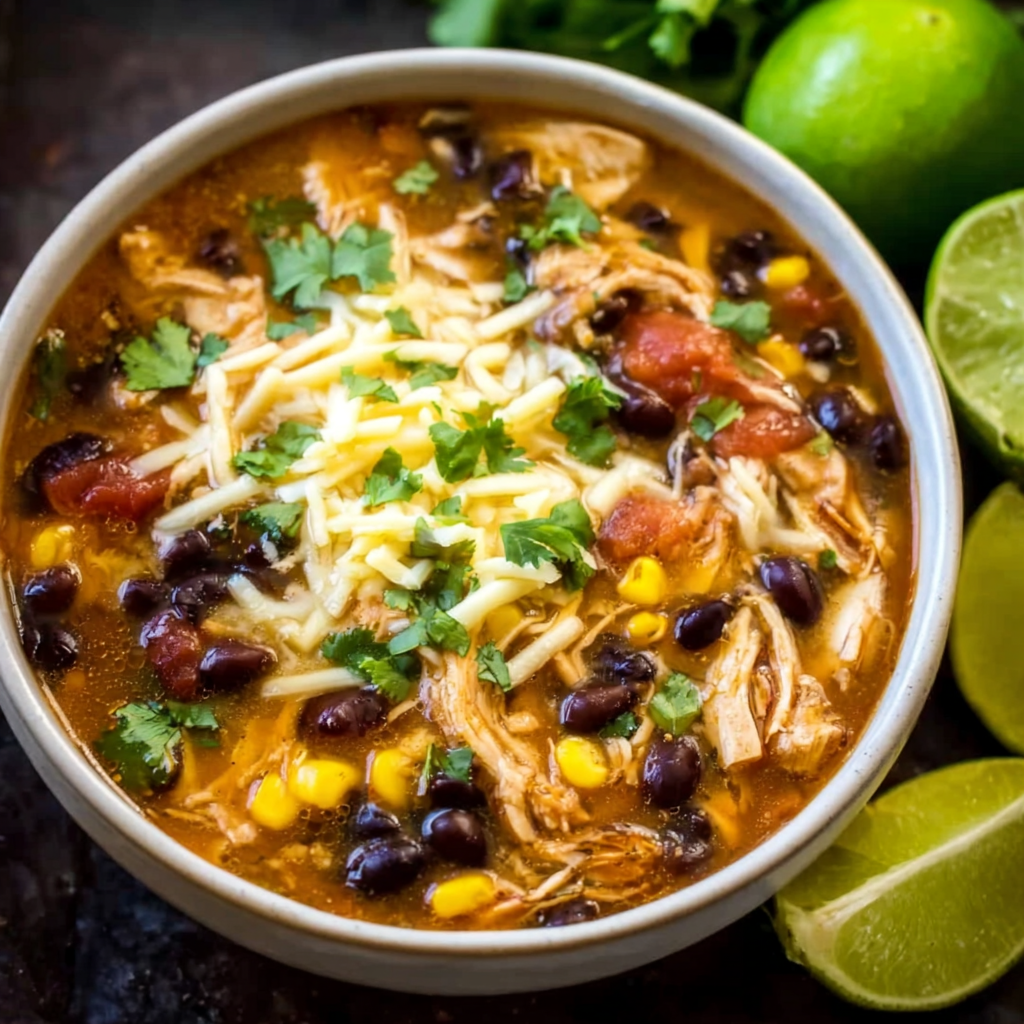 It combines tender shredded chicken, hearty beans, sweet corn, and a rich tomato-based broth seasoned with taco spices. Every bite is bold, comforting, and satisfying.