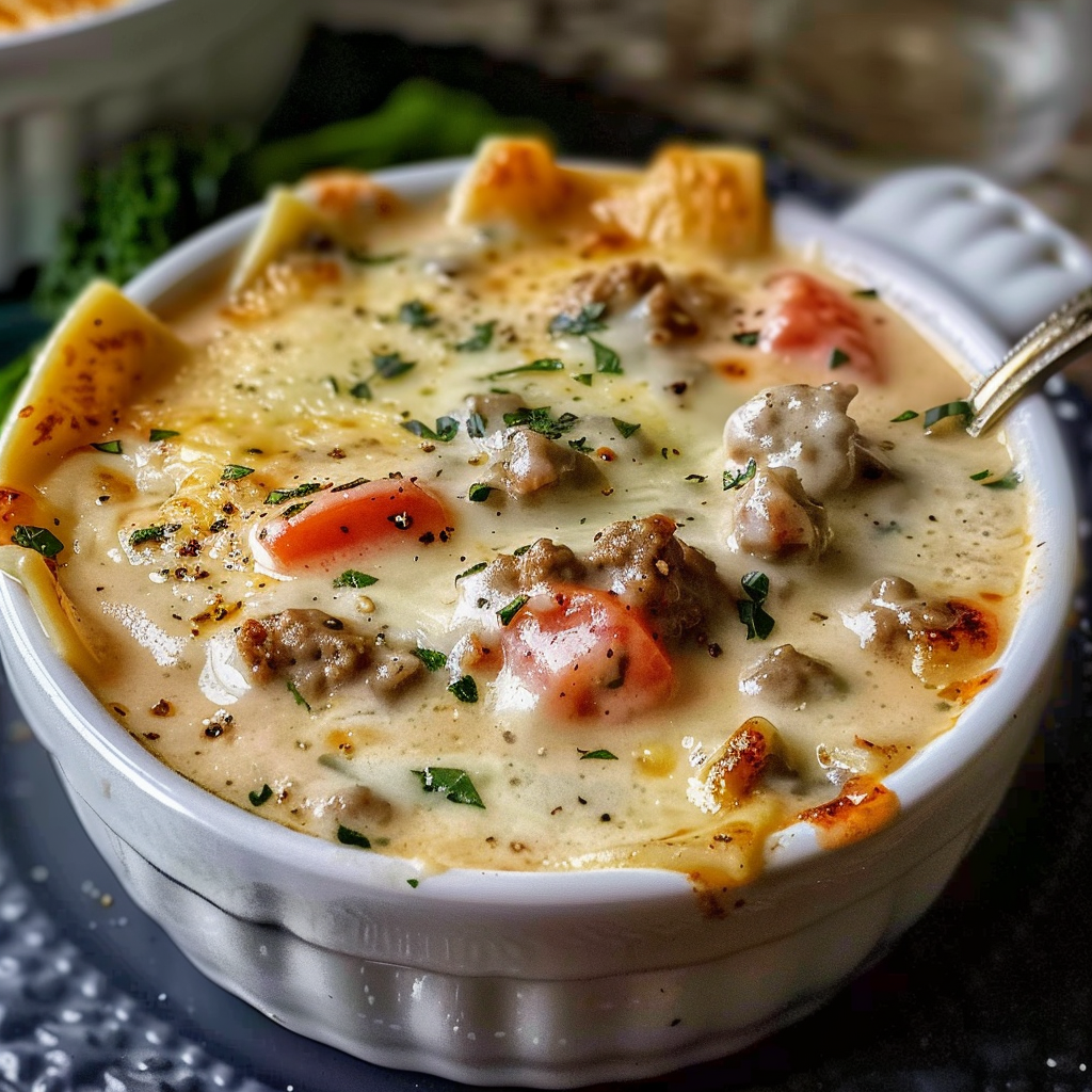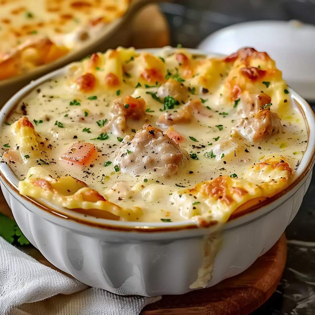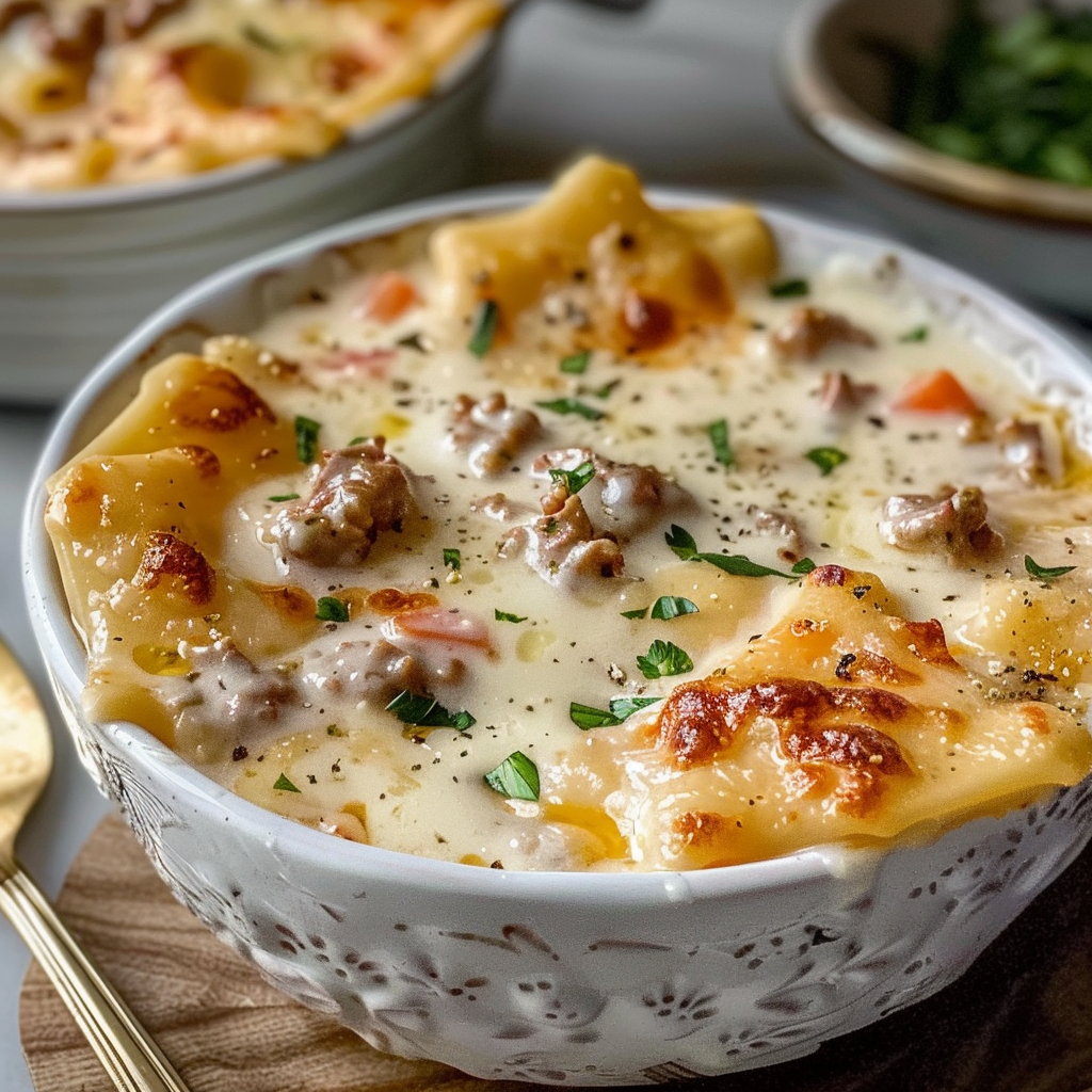 Creamy Alfredo Lasagna Soup is a one-pot comfort dish that captures all the flavors of classic lasagna in a rich, cheesy soup format. Made with ground chicken or beef, Alfredo sauce, diced tomatoes, broken lasagna noodles, and a blend of mozzarella and Parmesan, it’s cozy, indulgent, and perfect for busy weeknights or relaxed weekends.