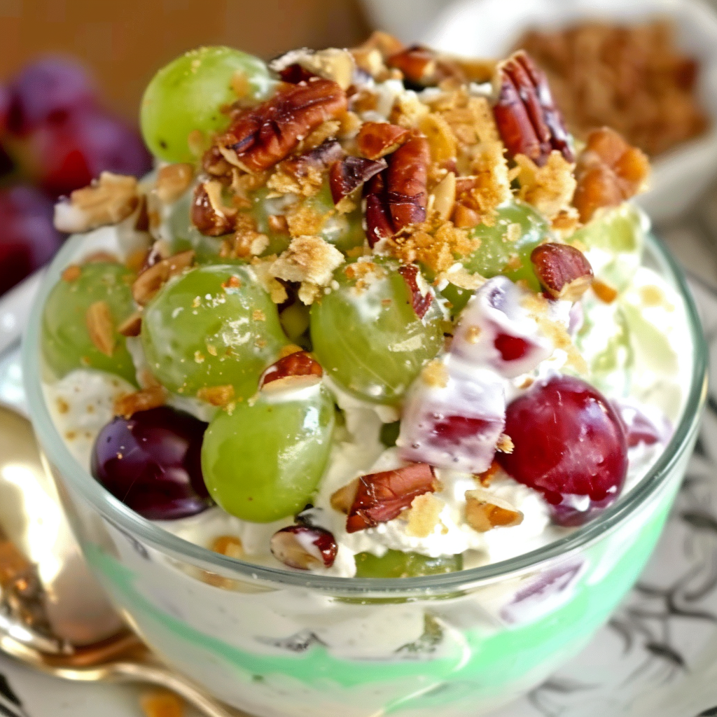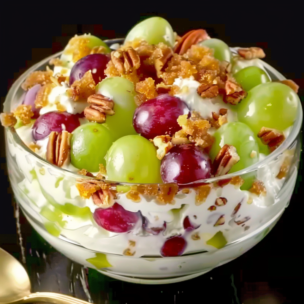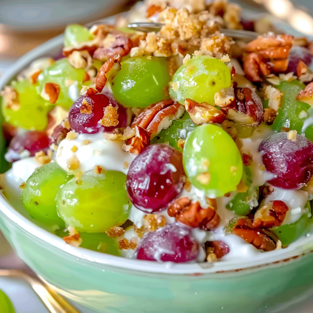 What makes this dish so popular is its combination of simple ingredients and luxurious texture. The mix of red and green seedless grapes creates a vibrant base, while the creamy dressing of cream cheese and sour cream adds richness. Topped with a brown sugar pecan mixture, it’s sweet, tangy, and crunchy—all in one spoonful.