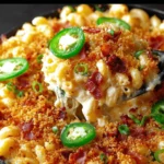 This jalapeño popper mac and cheese is the ultimate spicy comfort food mashup — extra creamy, rich, and packed with bold flavor. A blend of sharp cheddar, Monterey Jack, and smooth cream cheese creates the velvety base, while diced jalapeños bring just the right amount of kick. Topped with crunchy breadcrumbs, crispy turkey bacon, and fresh chives, this dish delivers an unforgettable bite every time.