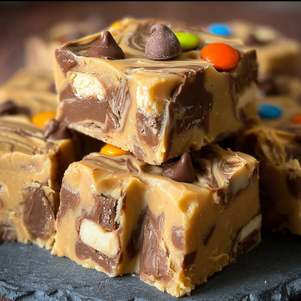 What makes this fudge stand out is the combination of textures and flavors. The base is made with peanut butter and sweetened condensed milk, giving it a velvety consistency that melts in your mouth. Chopped candy bars—such as Snickers, Milky Way, or Reese’s—are folded in or sprinkled on top for a gooey, chocolatey crunch in every bite.