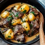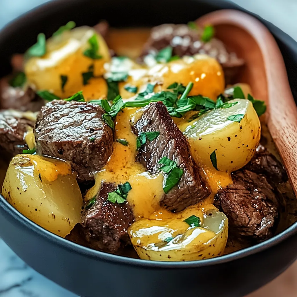 Tender steak bites and perfectly cooked potatoes mingle in a savory, creamy sauce, then get crowned with melted cheese and crispy bacon—all made effortlessly in your slow cooker. It’s like a loaded baked potato in casserole form!