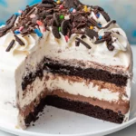 1. Can I use different flavors of ice cream for this cake? Absolutely! This cake is incredibly versatile when it comes to flavor. While the combination of vanilla and chocolate ice cream is classic, you can swap these out for any ice cream flavors you love. Try cookies and cream, mint chocolate chip, or even strawberry for a fun twist on the traditional flavor profile. 2. How can I store leftover ice cream cake? To store leftover ice cream cake, cover it tightly with plastic wrap or place it in an airtight container to prevent freezer burn. It can stay in the freezer for up to 1-2 weeks. Just make sure to slice the cake before storing it to make serving easier. 3. Can I make this cake ahead of time? Yes, this cake is perfect for making ahead! You can prepare the entire cake up to 2 days in advance. Just make sure to store it in the freezer, and when you’re ready to serve, let it sit for a few minutes before slicing to make cutting easier. 4. How do I make sure the cake layers don’t stick to the pan? To ensure the cake layers come out easily, grease and flour your cake pans before adding the batter. Alternatively, you can line the pans with parchment paper to prevent sticking. Allow the cakes to cool completely before removing them from the pans to maintain their shape. 5. Can I make this cake without the fudge layer? While the fudge layer adds a rich, indulgent flavor, you can skip it if you prefer a simpler cake. The layers of ice cream and cake will still be delicious, especially with the whipped topping and crushed Oreos. You can even drizzle some extra chocolate syrup on top for a little sweetness in place of the fudge. 6. Can I use homemade whipped cream instead of Cool Whip? Yes, homemade whipped cream can easily replace the store-bought whipped topping. For best results, make sure your heavy cream is well-chilled, and whip it until soft peaks form. You can sweeten it with powdered sugar to match the sweetness of Cool Whip.Conclusion