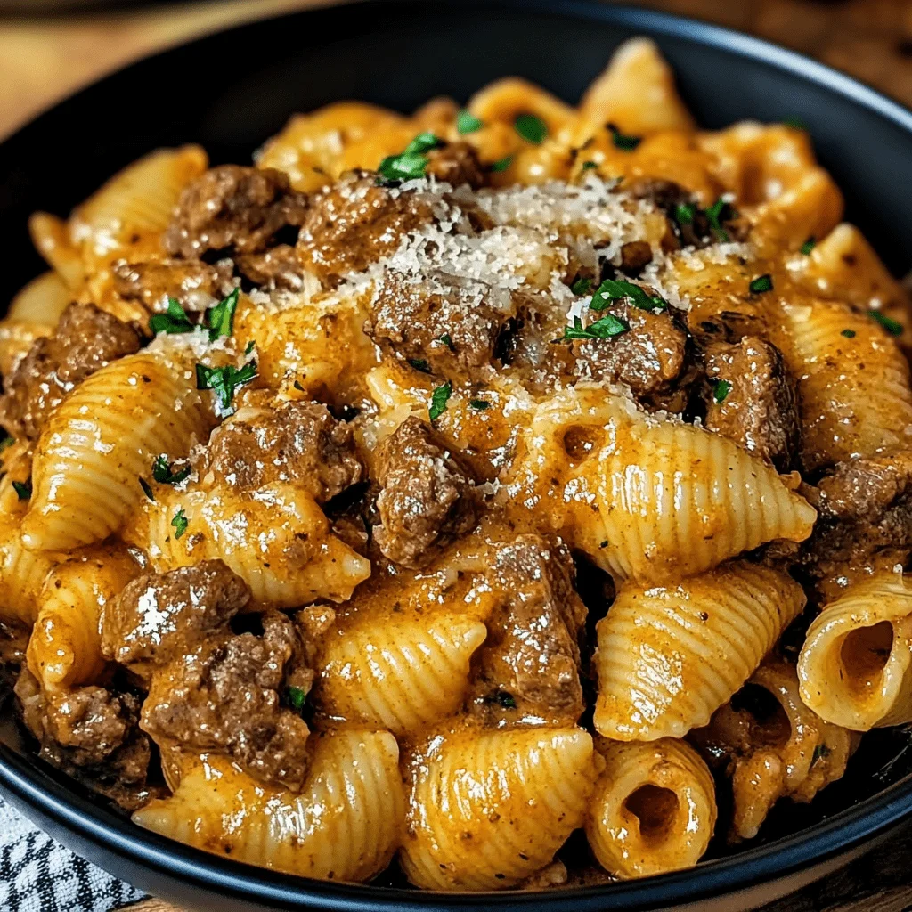 Once the sauce is ready, return the steak and pasta to the skillet and toss everything together. The shells should be fully coated, and the steak will reheat gently without turning rubbery. Finish it all off with a sprinkle of chopped fresh parsley for a pop of color and a bit of freshness.