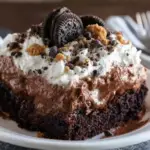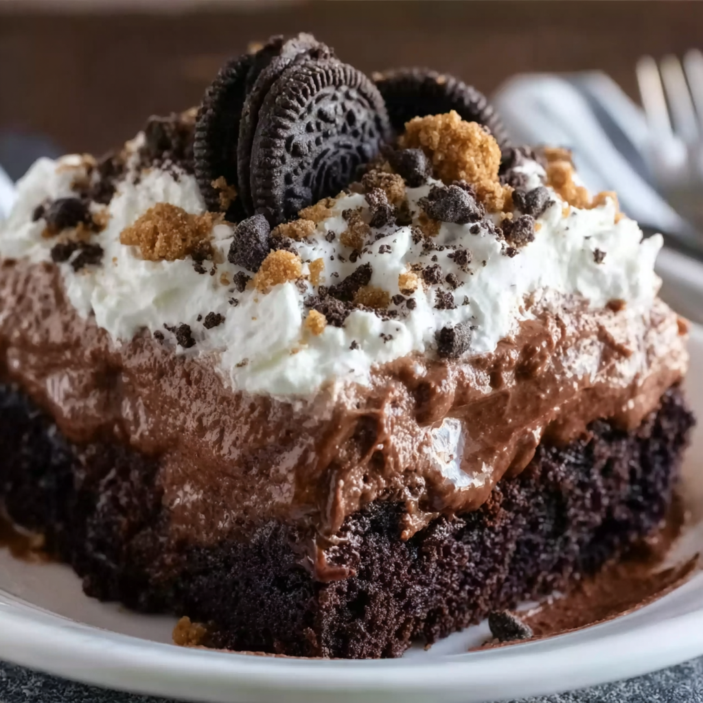 Death by Chocolate Poke Cake isn’t just another chocolate dessert—it’s an experience. From the moment you slice into the soft, pudding-infused layers to the final bite of creamy whipped topping and chocolate shavings, every forkful delivers pure satisfaction. This cake is bold, rich, and unapologetically indulgent. It’s meant for celebrations, gatherings, and those moments when only the most decadent dessert will do. What makes this recipe truly special is its balance. Despite the layers of chocolate—cake, pudding, ganache, whipped cream, chips—it never feels overwhelming. Instead, the textures work together beautifully. The soft cake absorbs the pudding, the ganache adds silky richness, and the whipped topping keeps everything light enough to enjoy a full slice. It’s also wonderfully versatile. You can dress it up for birthdays, holidays, or dinner parties. Add berries for elegance, extra chocolate chunks for intensity, or keep it classic and simple. However you serve it, this cake has one guaranteed result: people will ask for the recipe. If you’re searching for the ultimate chocolate poke cake that’s rich, moist, and impossible to resist, this is it. Make it once, and it just might become your signature dessert. PrintEasy Death by Chocolate Poke Cake – Moist & Fudgy Chocolate Cake