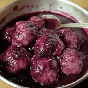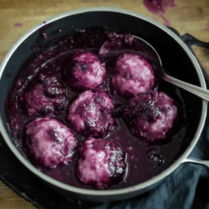 Serve the dumplings warm, ideally just after cooking. The berry syrup should be thick and glossy, the dumplings soft and pillowy. Spoon them into individual bowls or serve family-style in a deep dish for that cozy, rustic vibe.