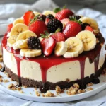 What sets this dessert apart is its layered perfection: a buttery crust, a velvety cheesecake filling, and a medley of fresh fruits like bananas, strawberries, and pineapple. The finishing touches—chocolate drizzle, whipped cream, and crunchy chopped nuts—elevate it to pure bliss. It’s ideal for when you want a crowd-pleasing dessert that doesn’t heat up your kitchen. 🍰🍌