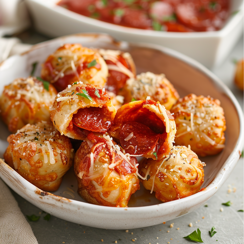 These bites typically use pizza dough—either homemade or store-bought—as the outer shell. Inside, you’ll often find a piece of mozzarella string cheese, a dab of pizza sauce, and a few slices of pepperoni or another filling. Everything is sealed into a ball and baked until golden and crispy. This concept plays off the popularity of stuffed crust pizza, which first gained traction in the 1990s, as documented in the pizza entry on Wikipedia.