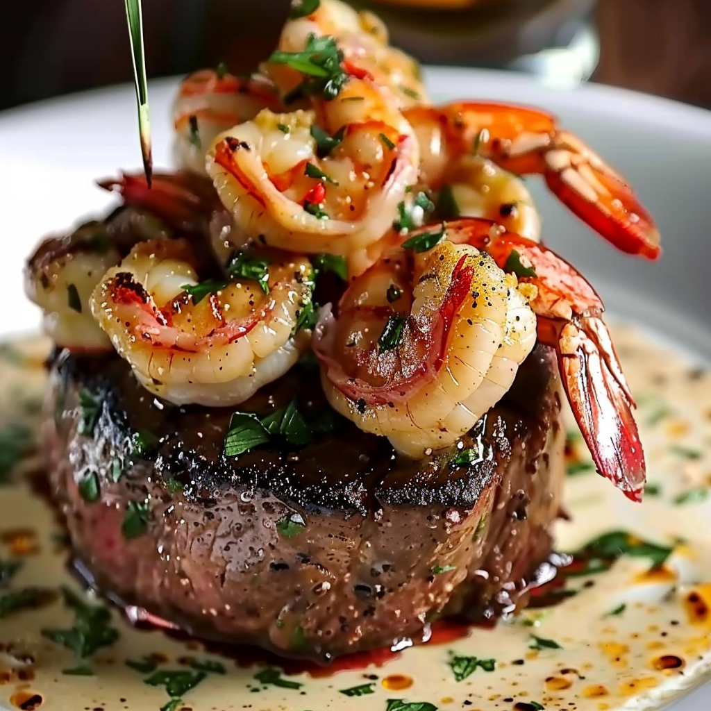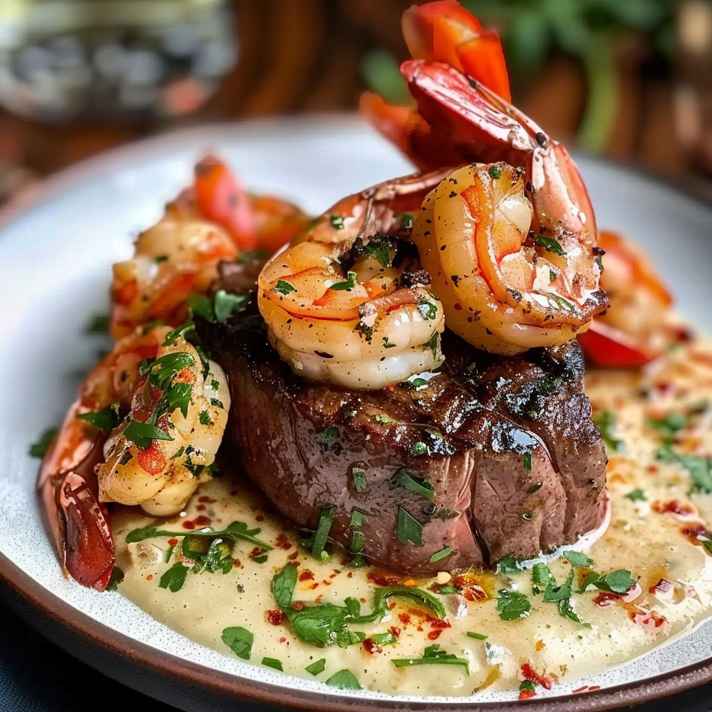 Filet Mignon with Shrimp and Lobster is a refined surf and turf recipe that delivers steakhouse elegance at home. Juicy, seared filet mignon is paired with buttery shrimp and tender lobster, all brought together with a fragrant garlic butter sauce. Ideal for romantic dinners, holidays, or any special occasion.