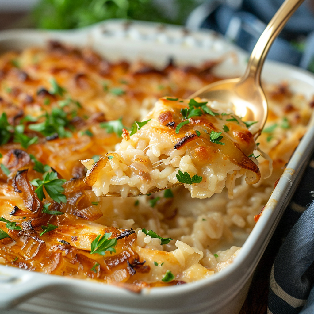 Historically, French onion soup—as detailed on Wikipedia—originated as a peasant dish made with caramelized onions and beef broth. Its transformation into a creamy baked rice casserole brings a modern twist to a classic flavor, making it accessible for home cooks seeking new ways to enjoy familiar ingredients.