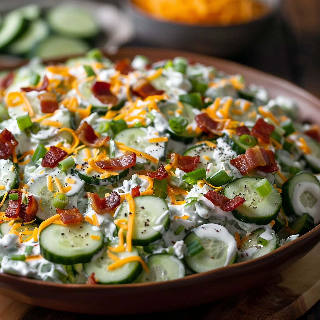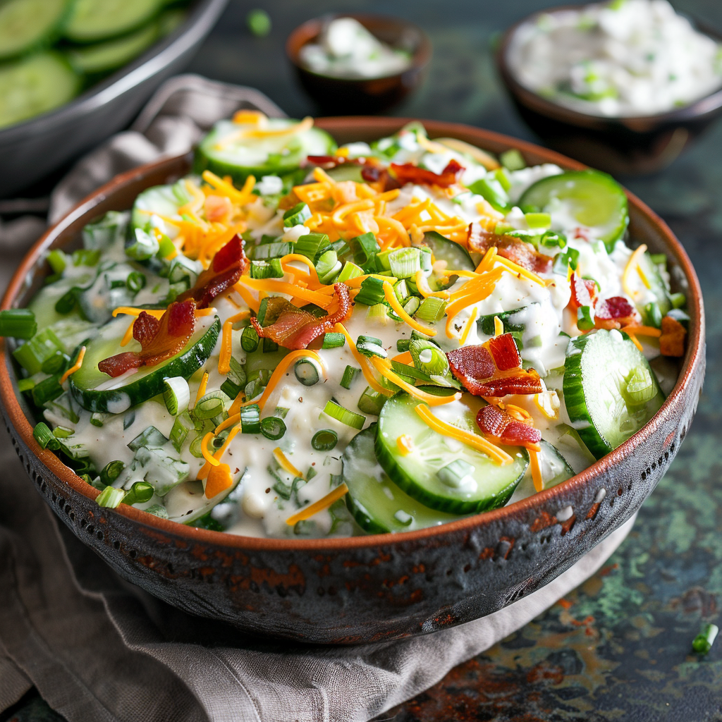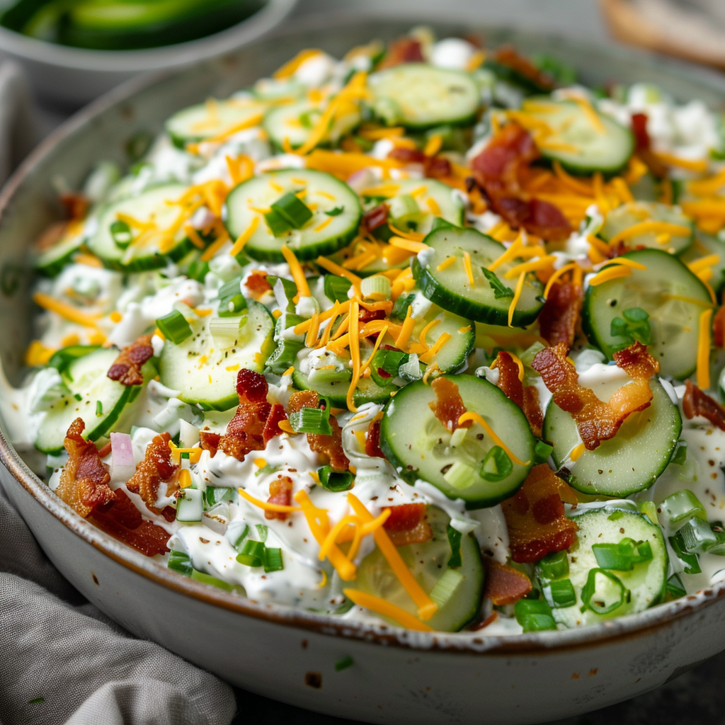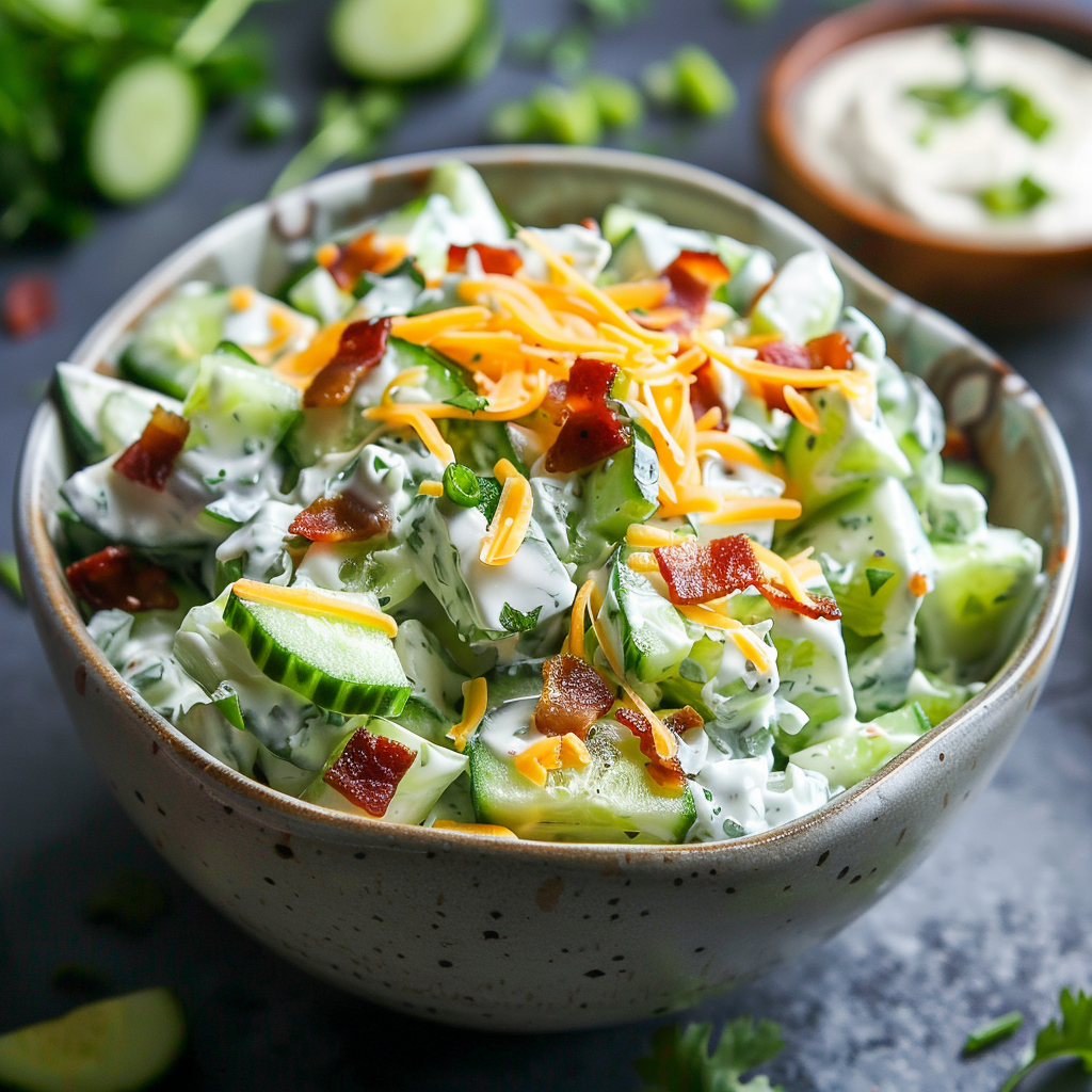 A classic cucumber salad is made with sliced or diced cucumbers, and often includes onions, tomatoes, and a dressing base of sour cream, yogurt, vinegar, or oil. This version includes ranch dressing, turkey bacon, and cheddar cheese for extra flavor.