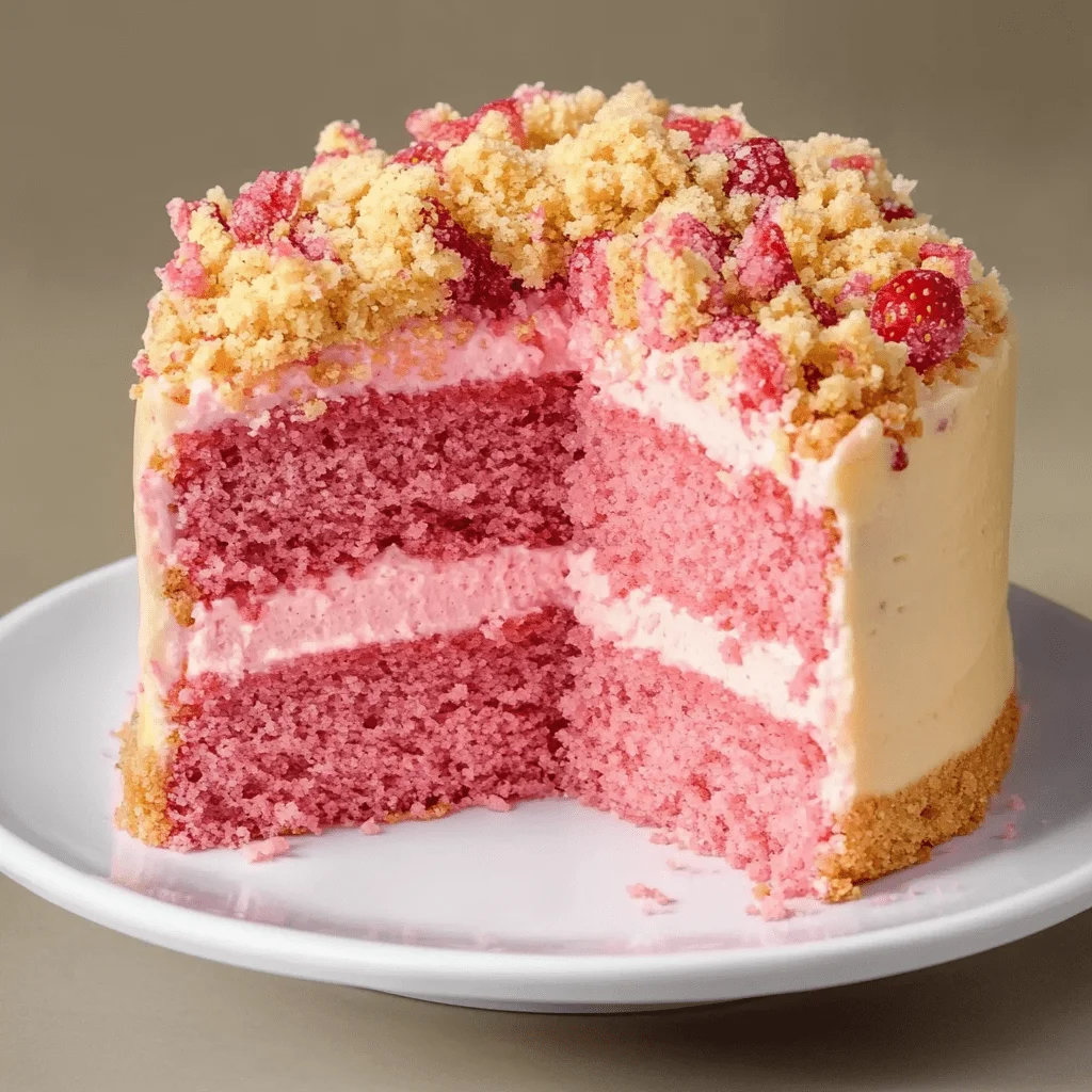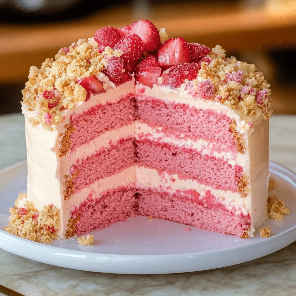 The cookie crumb coating gives this cake its signature look and adds a satisfying crunch. The base typically uses vanilla sandwich cookies which provide a sweet, creamy flavor, while the strawberry gelatin contributes a vibrant pink color and fruity aroma. A touch of red food coloring helps intensify that iconic strawberry shortcake bar look.