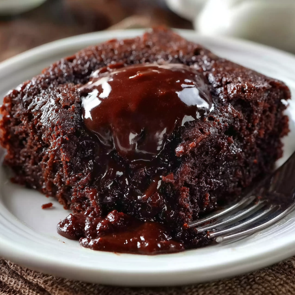 Bake at 350°F (175°C) for 35–40 minutes, or until the top looks set and slightly cracked. The cake layer will be firm, but underneath there will be a thick chocolate sauce.