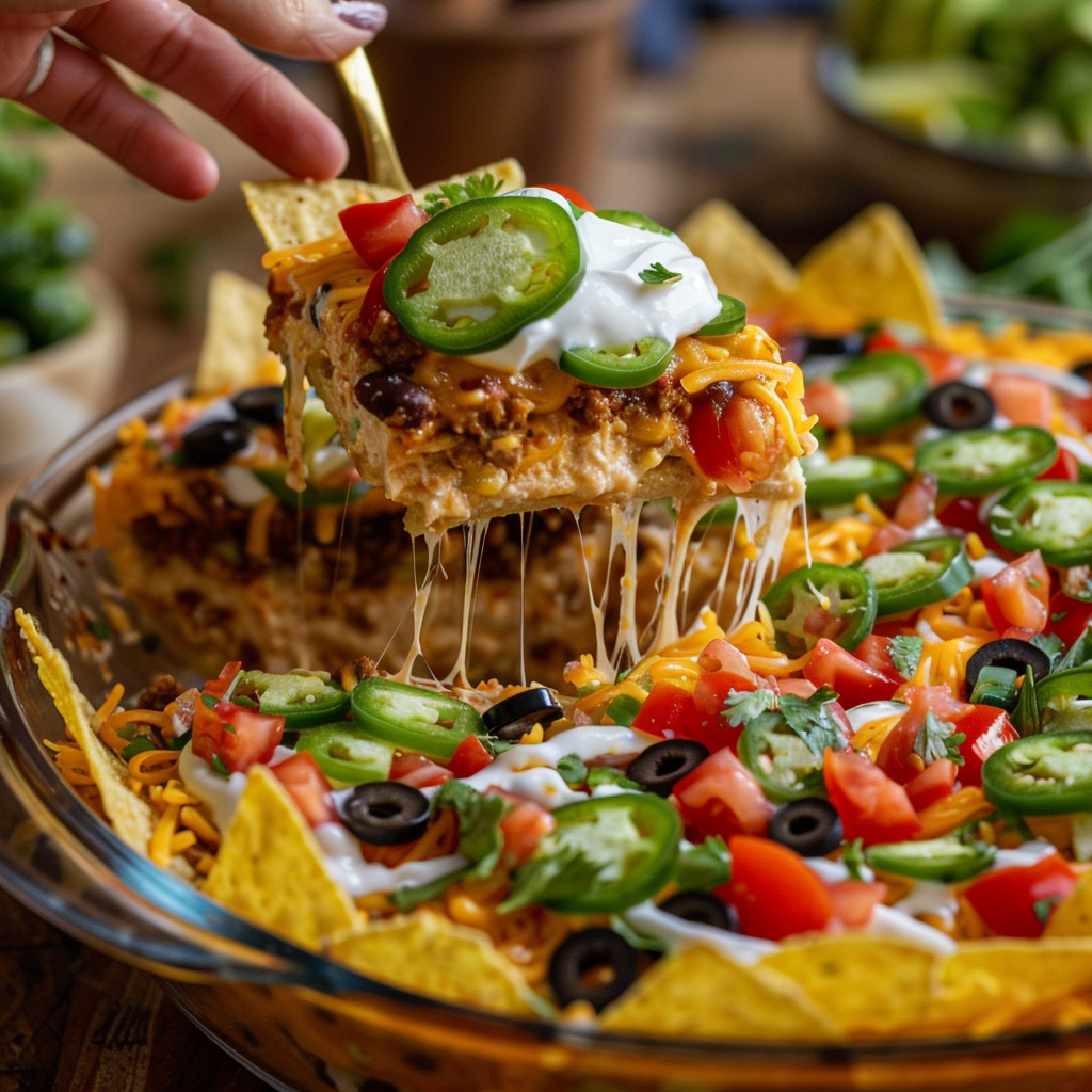 This dip has roots in Tex-Mex cuisine, which blends traditional Mexican ingredients with American-style preparations. You’ll often find it at football watch parties, summer barbecues, and festive holiday gatherings. With refried beans, guacamole, sour cream, and cheddar cheese layered under fresh veggies and zesty salsa, every scoop with a tortilla chip delivers a mix of textures and tastes that never fails to impress.