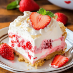 Strawberry Delight is the perfect no-bake treat to bring brightness to your dessert table. This luscious layered dessert is loved for its creamy, fruity layers and crunchy cookie crust. It’s a summertime favorite, combining the smoothness of cream cheese with the fresh burst of strawberries. Whether you’re planning a potluck, BBQ, or just need something quick and impressive, Strawberry Delight delivers a crowd-pleasing flavor in every bite.