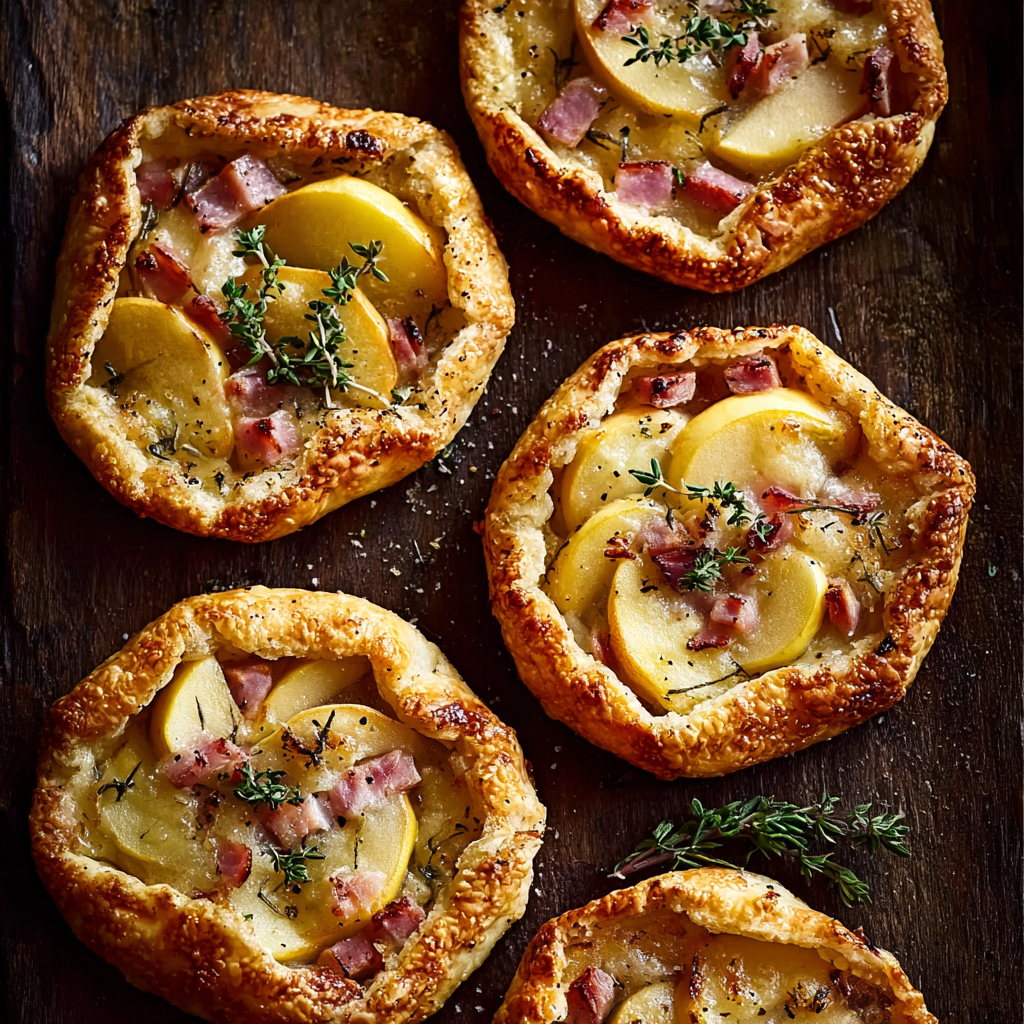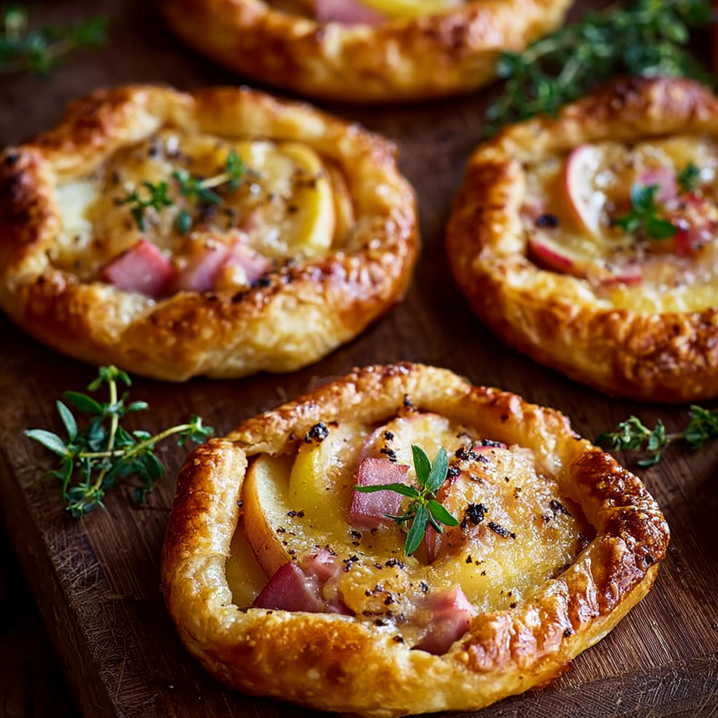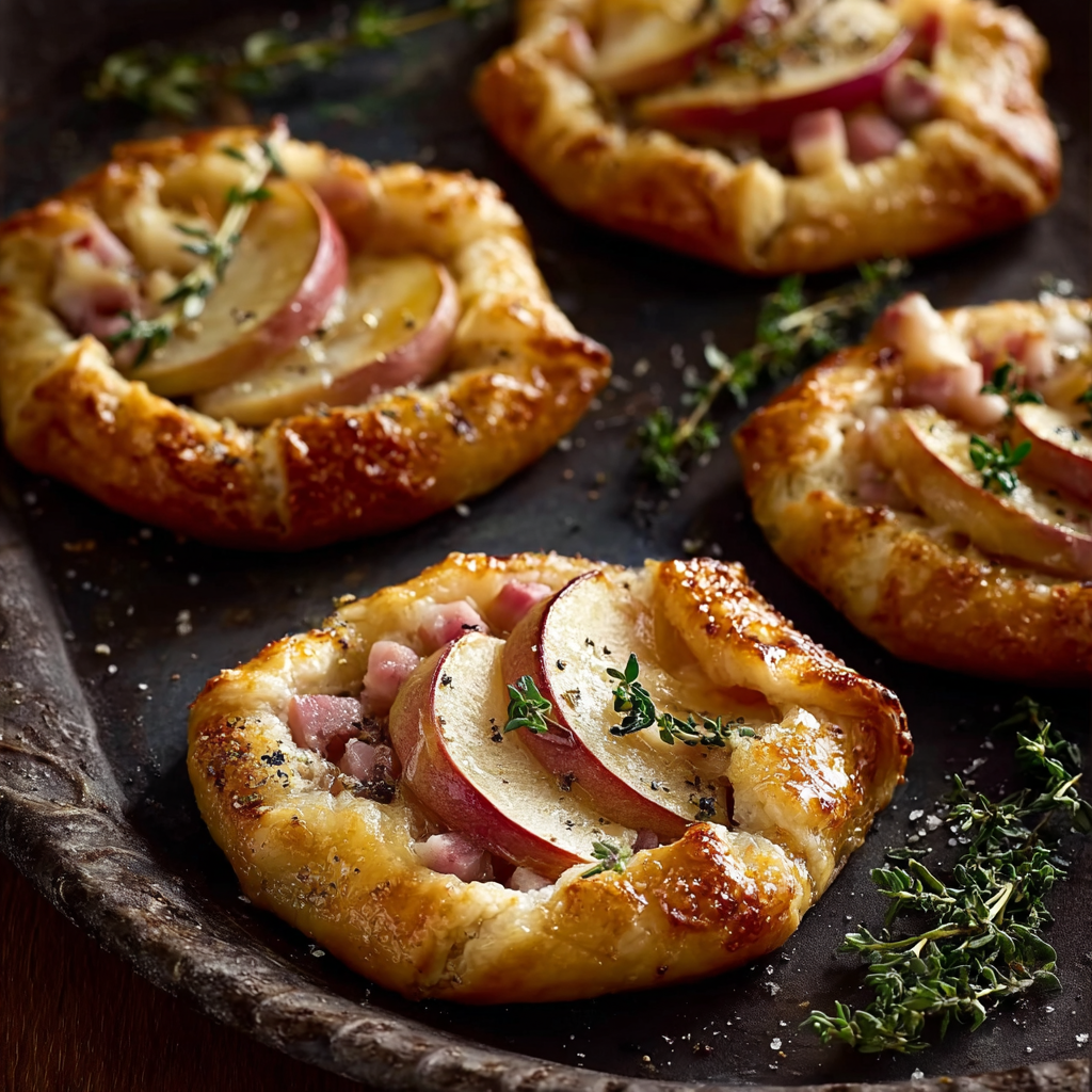 Mini Apple, Chicken Ham & Gruyère Galettes are a delightful fusion of savory and subtly sweet flavors, wrapped in a buttery, flaky crust. These rustic, hand-held tarts are easy to make yet elegant enough to serve at brunches, parties, or as a light dinner with salad. What sets this dish apart is the contrast between the sweet-tart apples, salty chicken ham, and nutty Gruyère cheese, all elevated by a hint of Dijon mustard and wrapped in golden pastry.