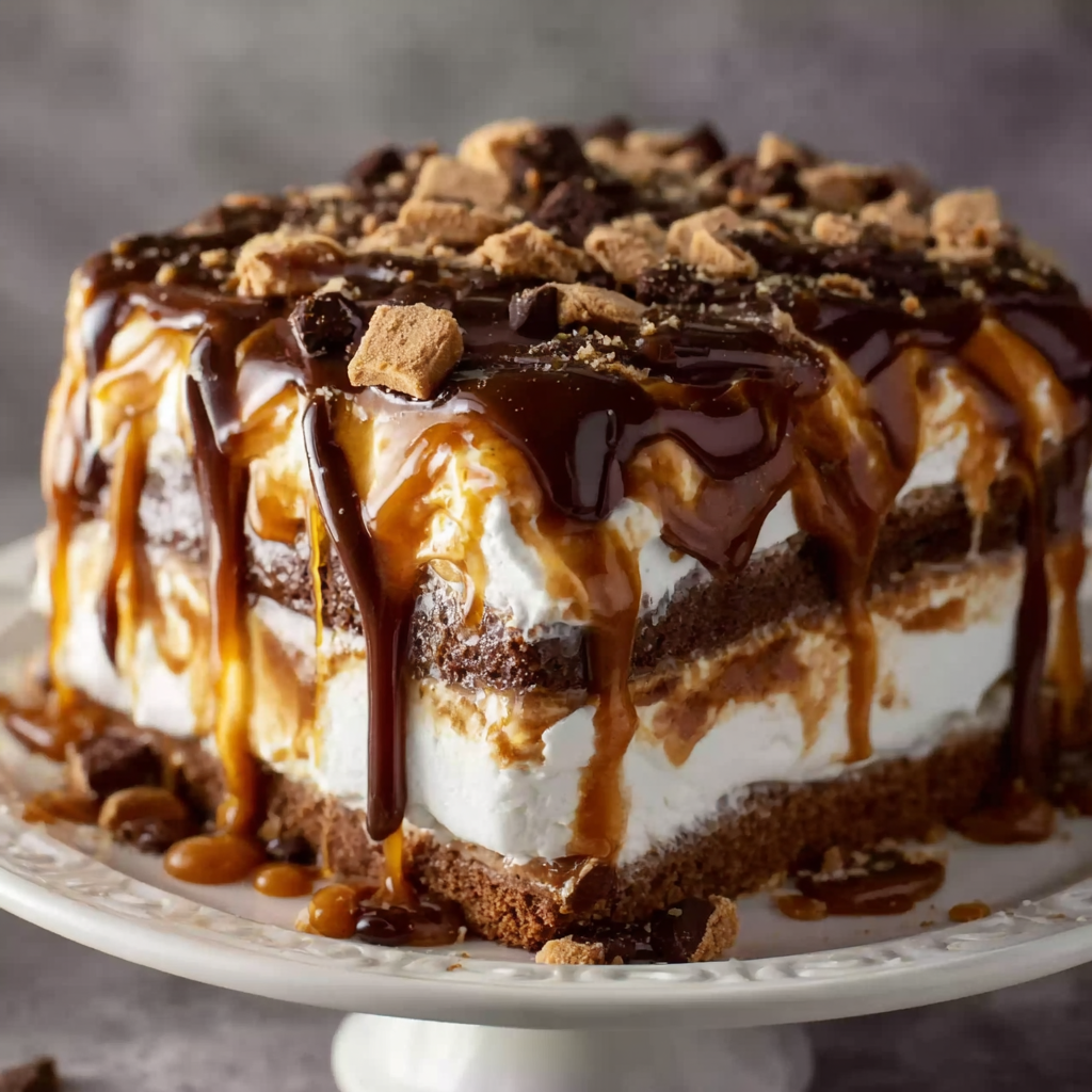 This peanut butter cookie lasagna is a rich, no-bake dessert layered with peanut butter cookies, creamy pudding, whipped topping, and a drizzle of chocolate. It’s easy, indulgent, and perfect for peanut butter lovers.