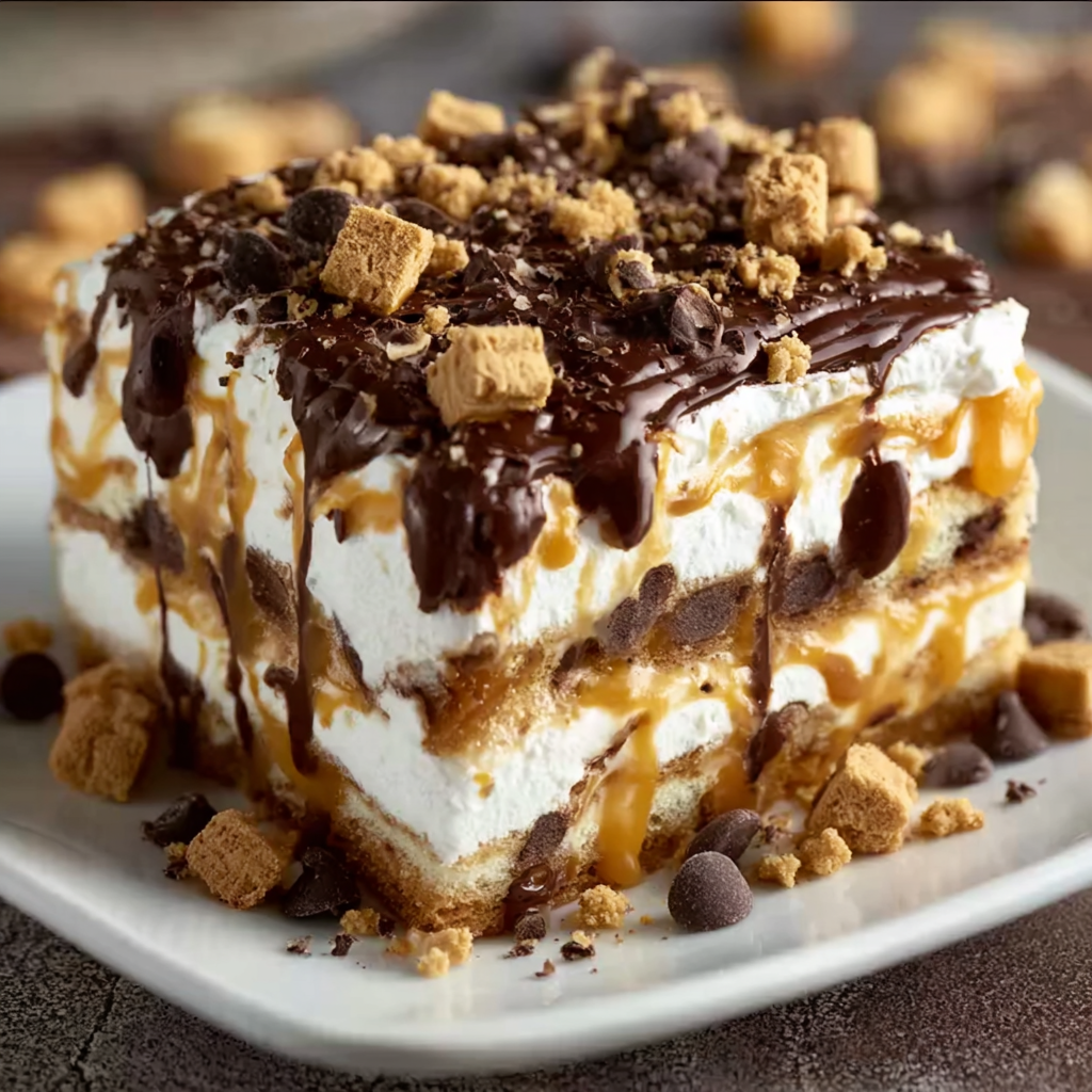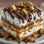Peanut Butter Cookie Lasagna is a no-bake layered dessert made with a cookie crust, creamy peanut butter filling, pudding layer, whipped topping, and optional chocolate drizzle or peanut butter chips. It’s called “lasagna” because of its beautiful stacked layers — not because it contains pasta.