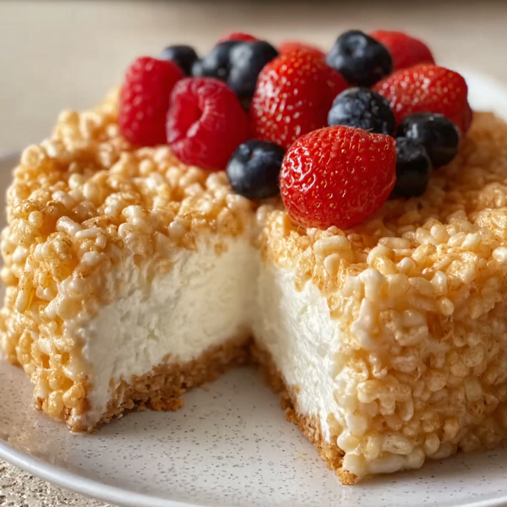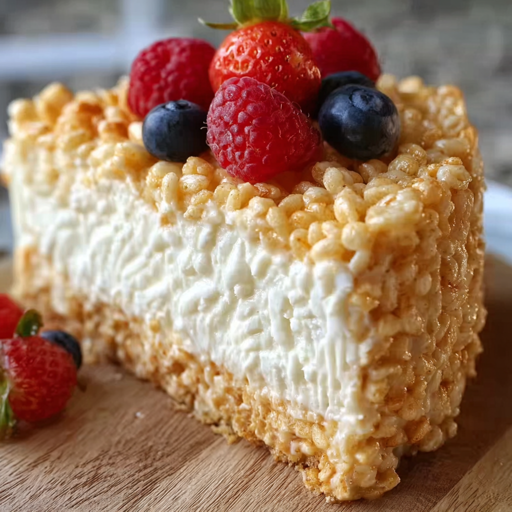 A creamy, no-bake cheesecake layered over a chewy Rice Krispy treat crust, perfect for gatherings and easy entertaining.