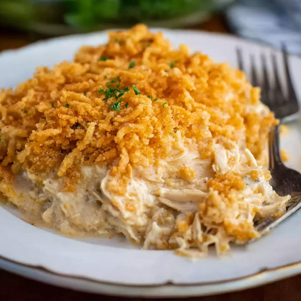 The combination of tender chicken, creamy sauce, and crunchy topping creates a balance of textures that makes every bite irresistible.