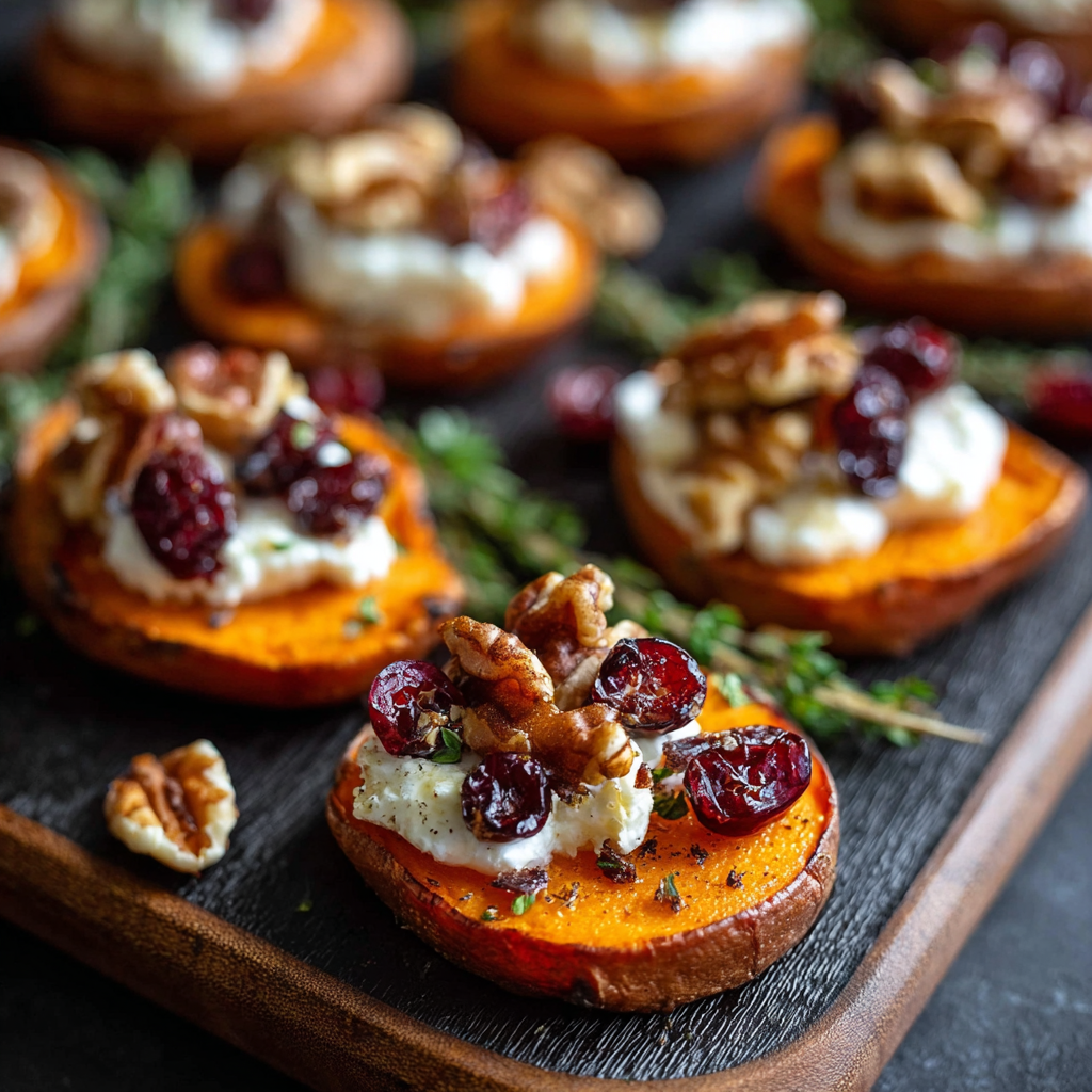 While roasted sweet potato rounds topped with goat cheese, cranberries, and candied walnuts are undeniably delicious, they also offer a surprising amount of nutritional value. Each ingredient brings its own set of health benefits—making this appetizer as nourishing as it is beautiful.