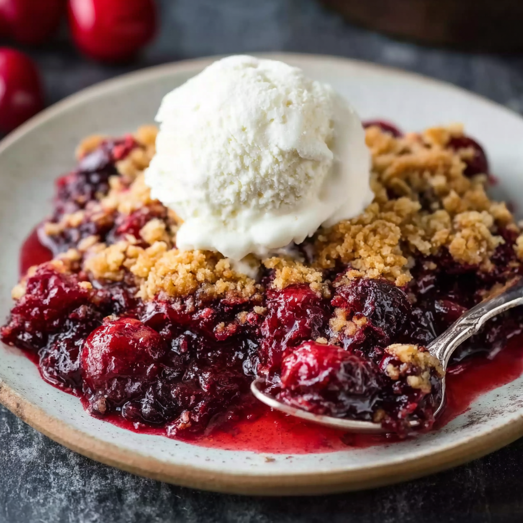 This dessert is incredibly versatile when it comes to serving. The classic choice is to spoon it warm into bowls and top it with vanilla ice cream. The cold, creamy ice cream melts into the warm cherries and buttery crumble, creating a dessert that feels both comforting and special.