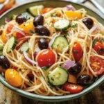 Spaghetti salad is a refreshing, cold pasta dish that blends the heartiness of spaghetti noodles with the crisp crunch of fresh vegetables and the bold punch of zesty dressings. It’s often served chilled and is a staple at potlucks, picnics, and cookouts. Unlike creamy macaroni salads, this one leans into a more vibrant, vinaigrette-based profile.