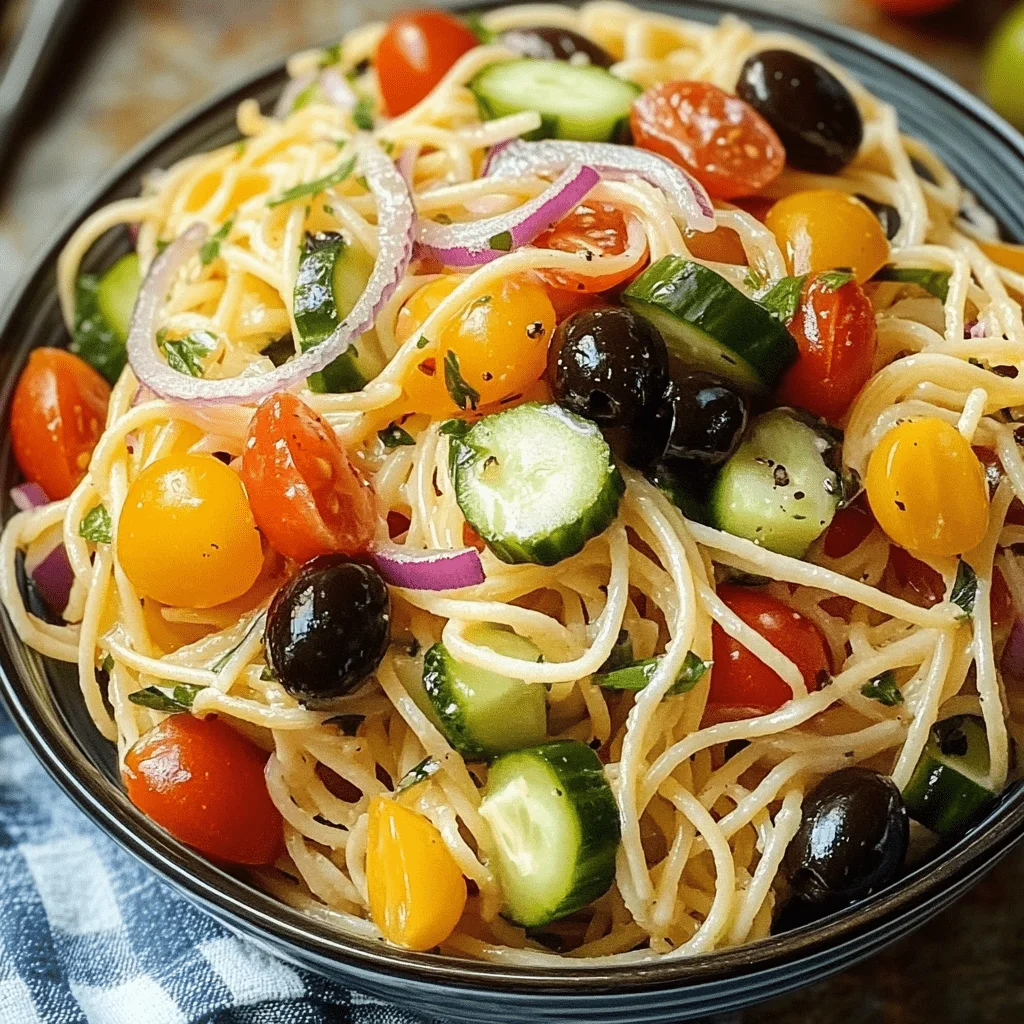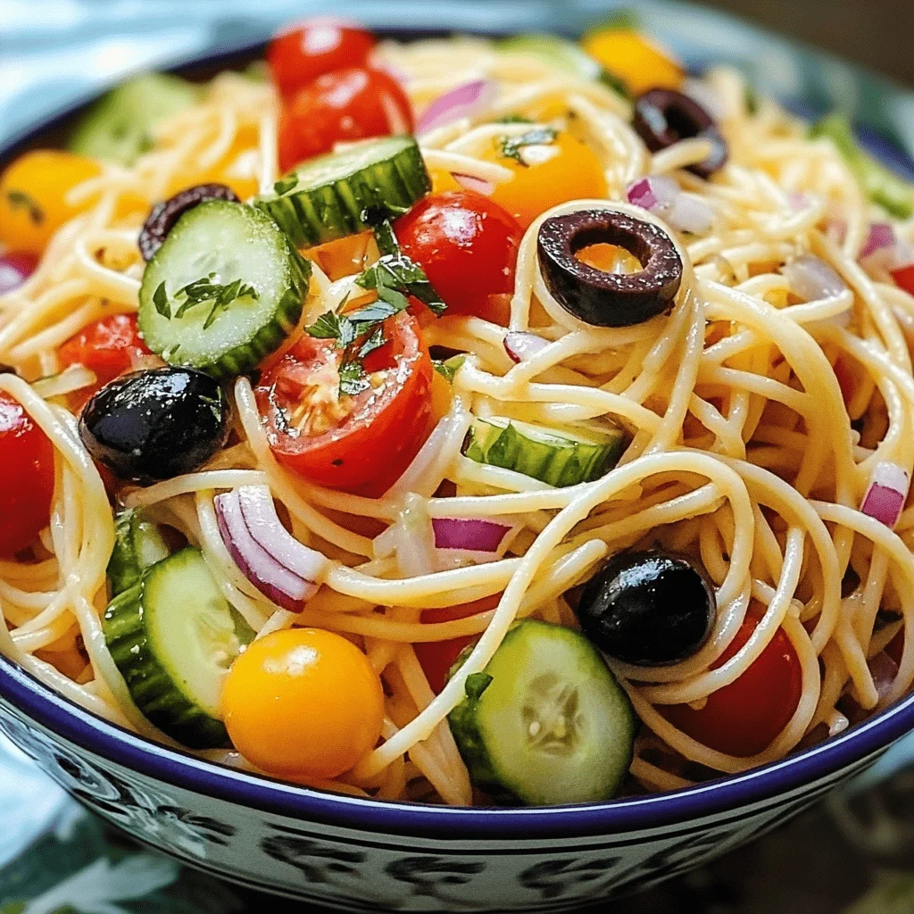 What makes spaghetti salad stand out is its ability to soak up flavor while staying light and fresh. The dish usually includes ingredients like bell peppers, cucumbers, cherry tomatoes, olives, and red onions, all tossed with spaghetti and a tangy dressing. You can even explore options like adding feta or mozzarella for a creamy finish.