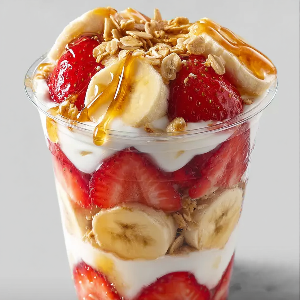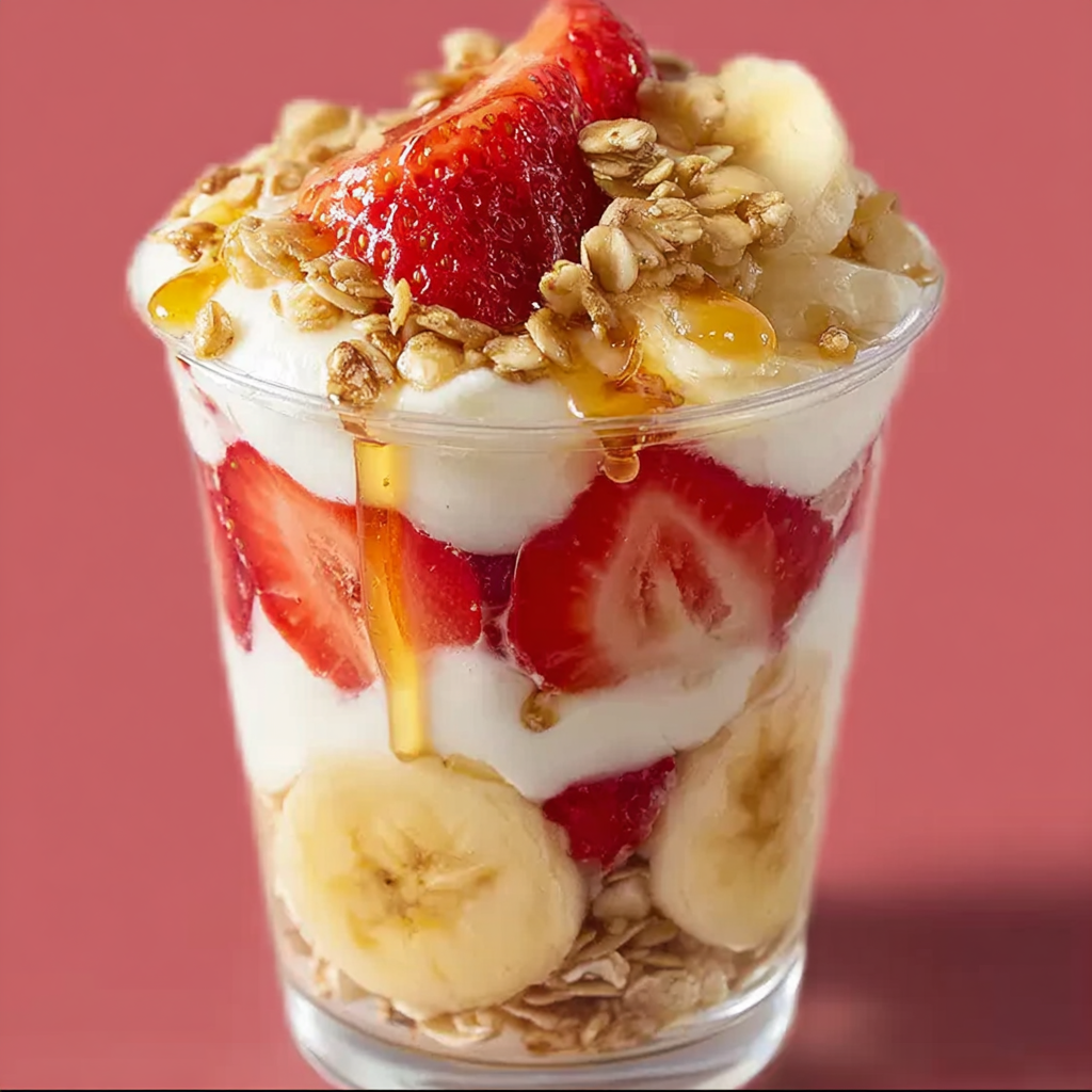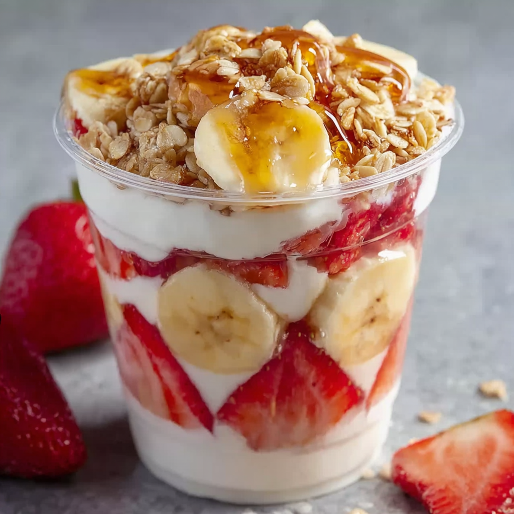 A quick, protein-packed breakfast made with creamy Greek yogurt, fresh strawberries, ripe bananas, and crunchy granola. Perfect for busy mornings or a refreshing snack.