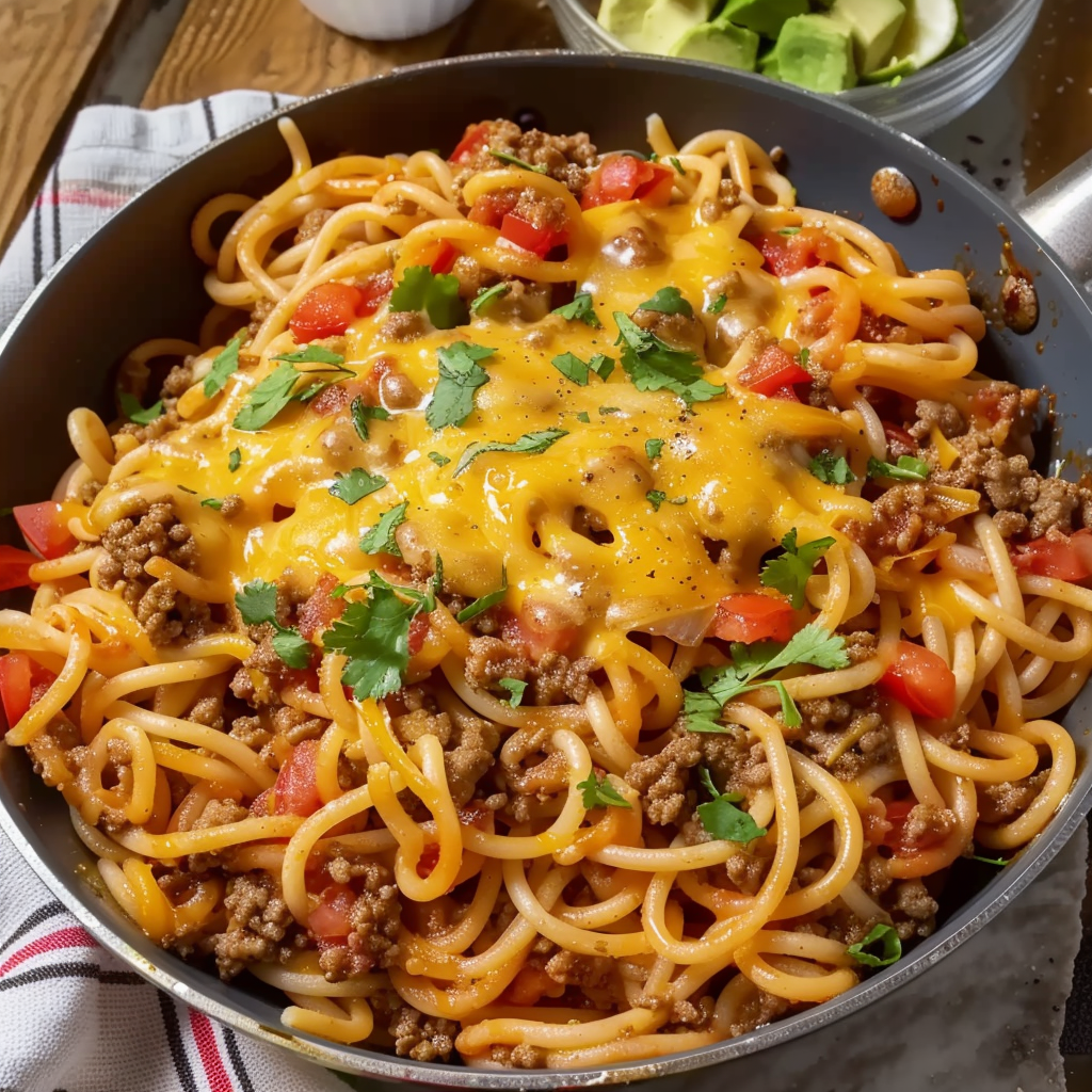 Taco night meets pasta night in this bold and cheesy Tex-Mex Taco Spaghetti recipe—where spicy ground beef, taco-seasoned tomato sauce, and melted cheese come together in one skillet for the ultimate weeknight dinner. It’s everything you love about tacos—beefy, zesty, cheesy—piled into a comforting spaghetti dish that’s perfect for families, meal prep, or a twist on Taco Tuesday.
