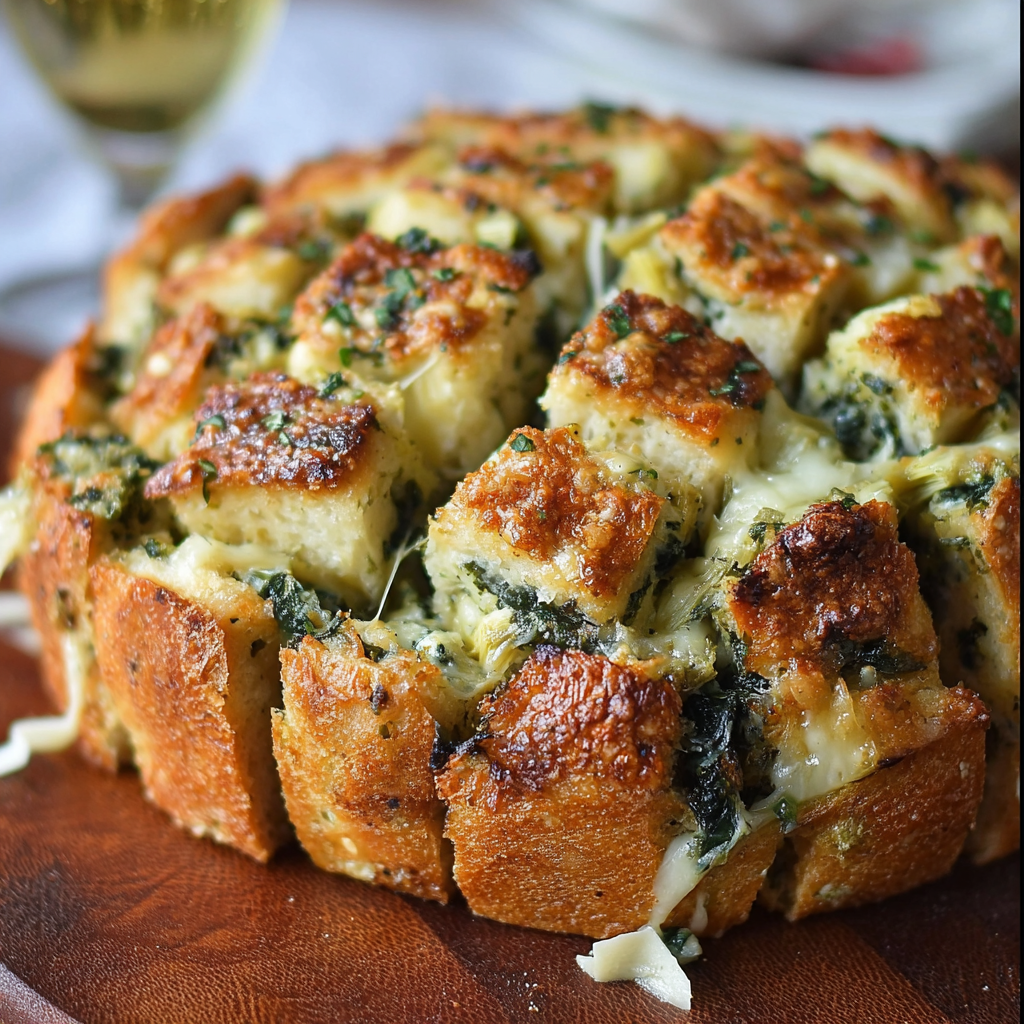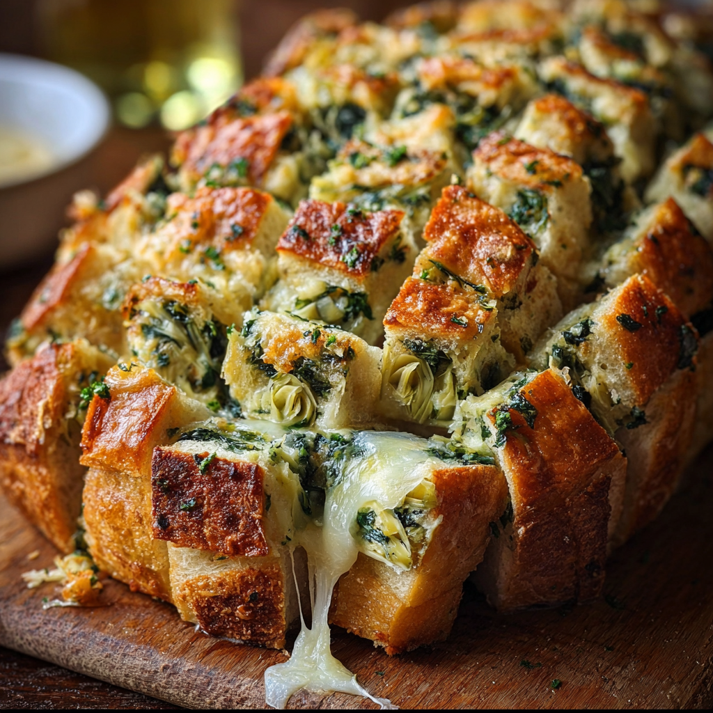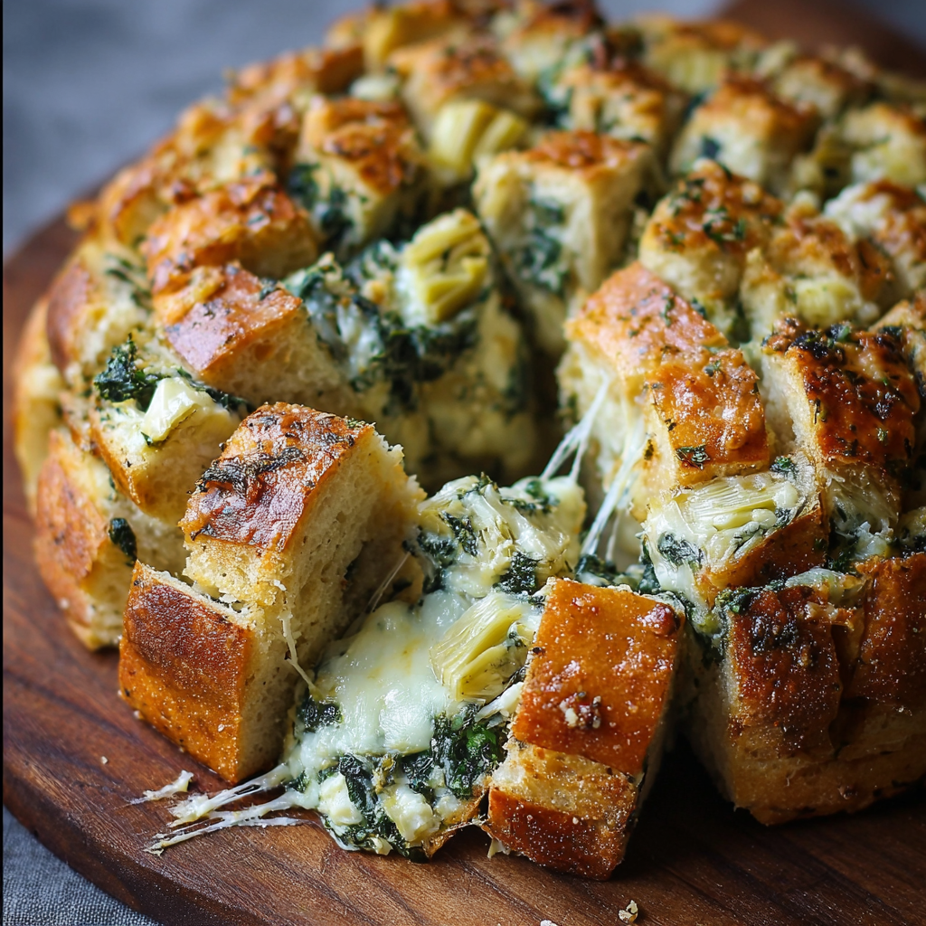 This cheesy spinach and artichoke pull-apart sourdough bread is the ultimate crowd-pleaser. Filled with creamy cheese, tender spinach, and briny artichokes, it’s baked until the bread is golden and the center is bubbling. Perfect for sharing, this appetizer is rich, satisfying, and effortlessly impressive.