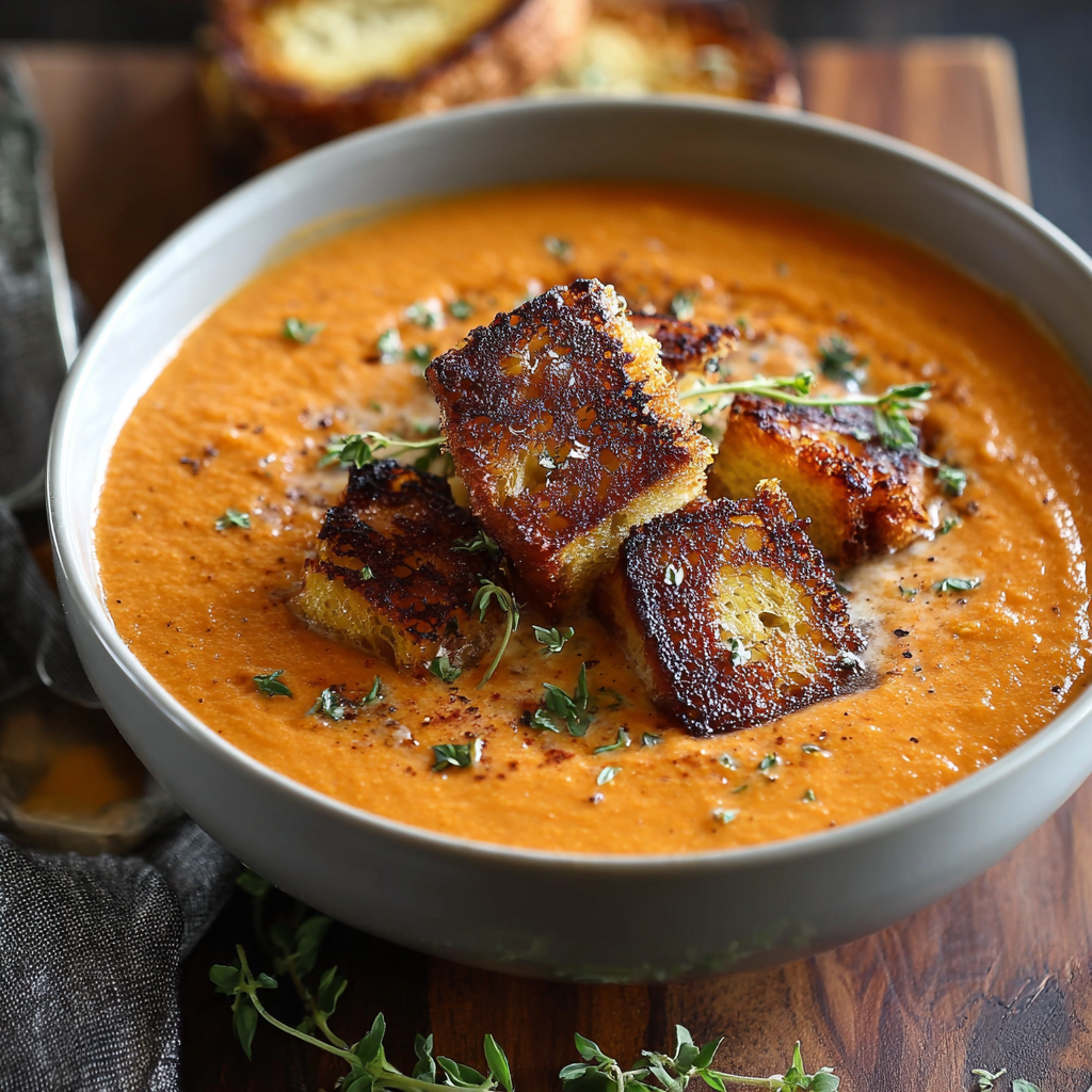 This creamy tomato soup crowned with grilled cheese croutons is the ultimate comfort meal. Silky, tangy tomato base enriched with cream is paired with crispy, cheesy croutons for a satisfying texture and flavor combo that’s both nostalgic and elevated.