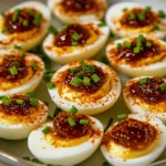 A modern twist on the classic deviled egg! These sweet and spicy pepper jelly deviled eggs combine creamy yolks with tangy Dijon mustard, silky mayonnaise, and a bold kick of pepper jelly. Garnished with fresh herbs and smoked paprika, they’re perfect for holidays, parties, and potlucks.