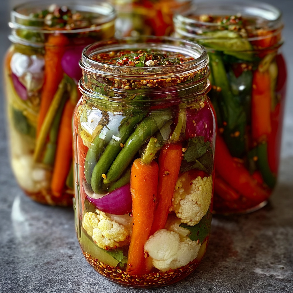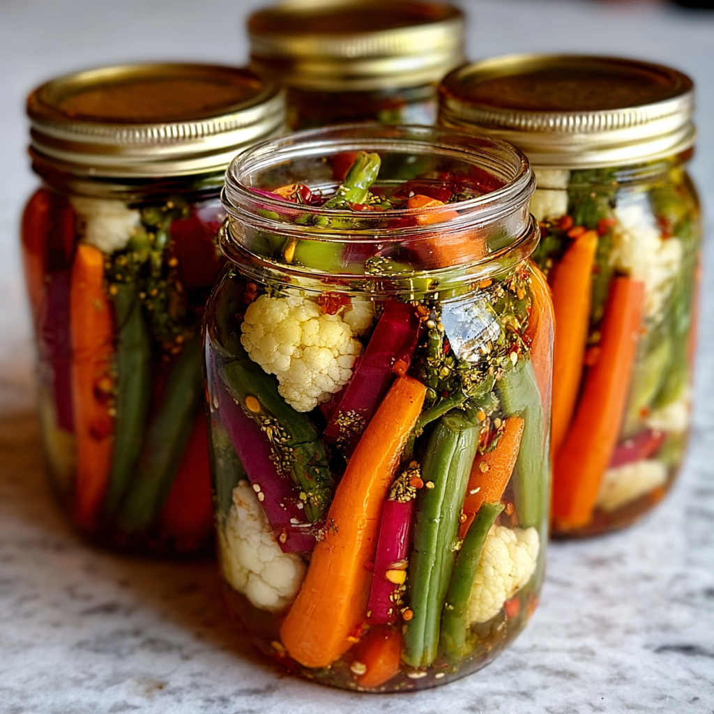 These crunchy tangy fridge pickled veggies are a vibrant, quick-pickling solution that packs bold flavor into every bite. Made with a zesty vinegar brine and customizable spice blends, they’re ready in 24 hours and perfect for layering on sandwiches, tossing into salads, or enjoying straight from the jar. No canning required—just crisp, colorful veggies soaked in flavor.