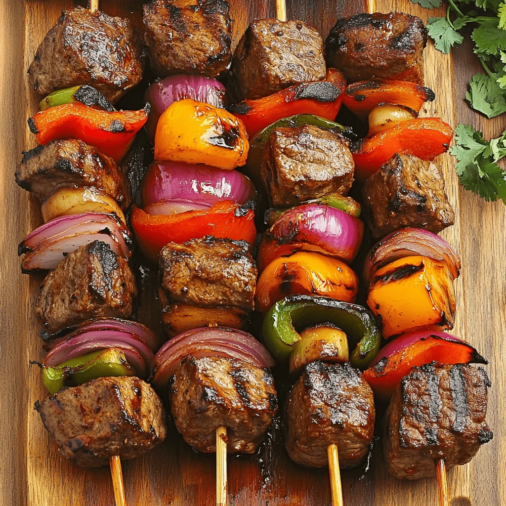 Cook kabobs for 10–12 minutes, turning every 2–3 minutes for even browning. Grill until steak reaches 135°F for medium-rare or 145°F for medium. -