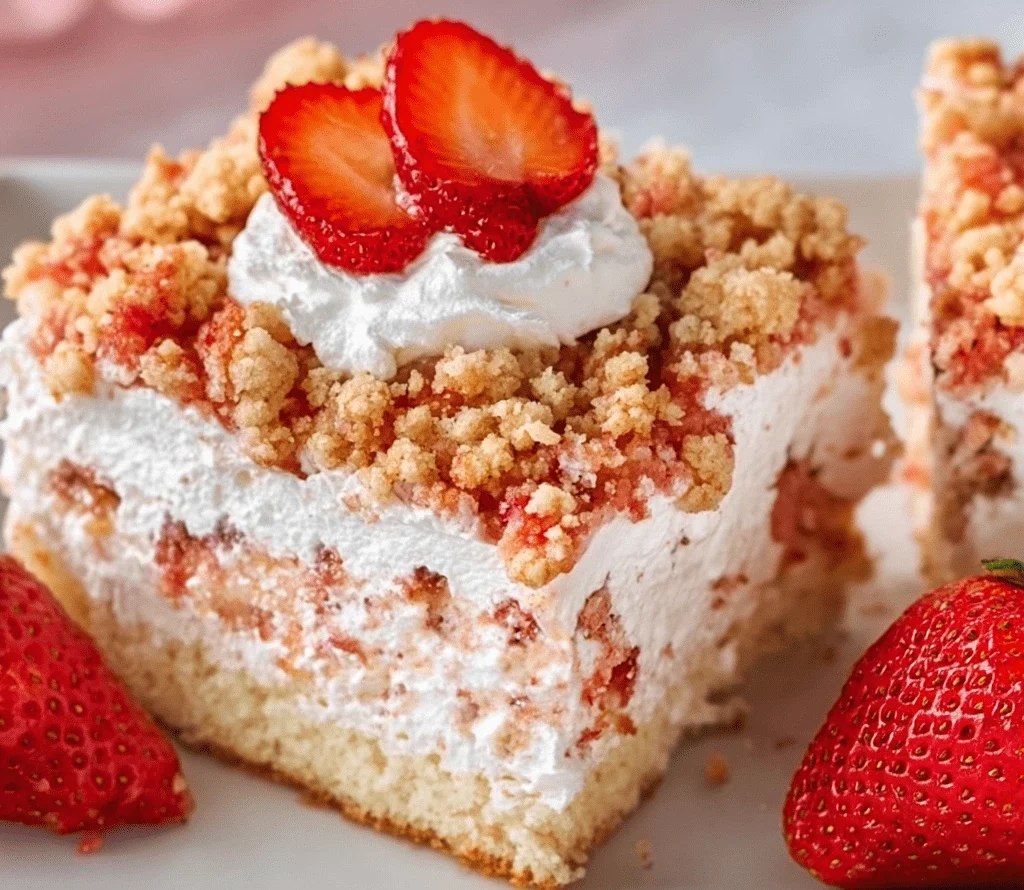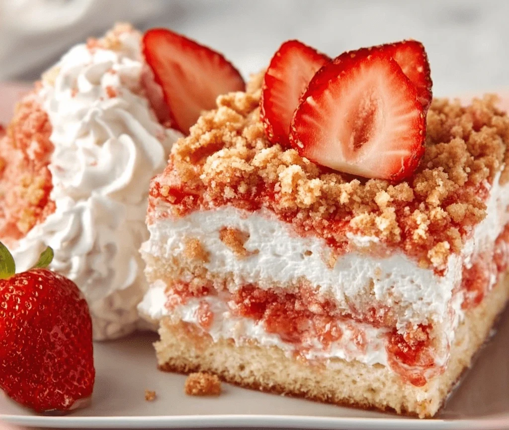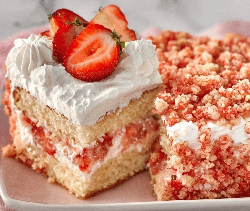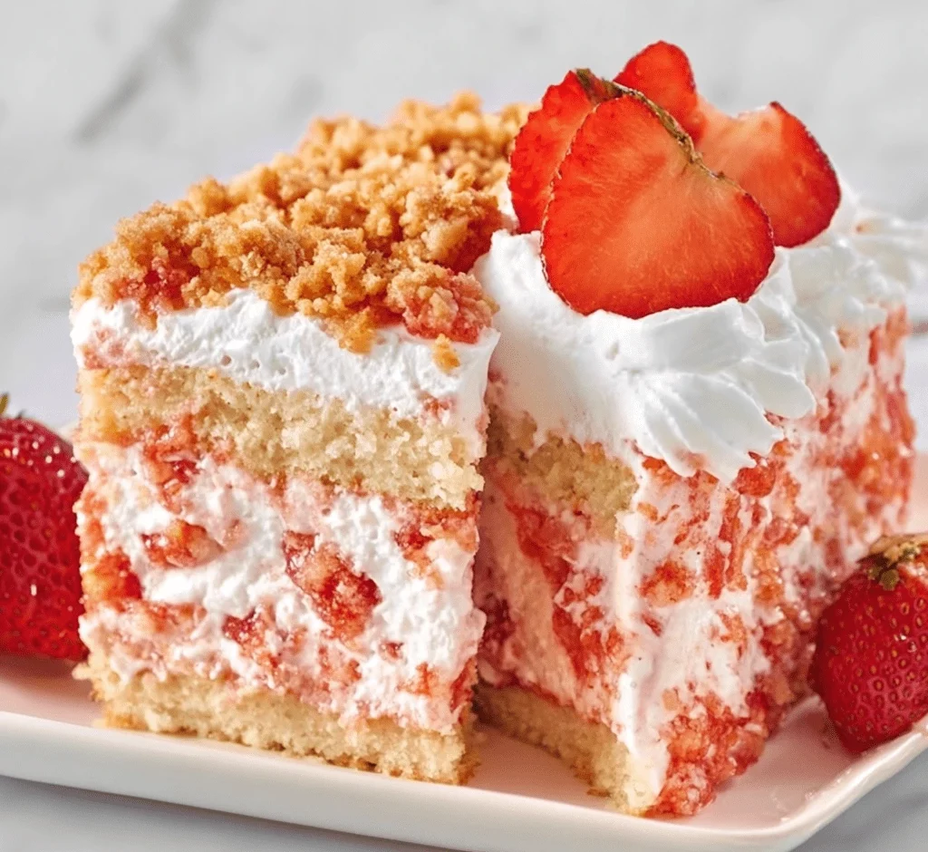 You’ll especially love how it blends flavors and textures effortlessly. It starts with a soft, moist cake base that soaks up a sweet strawberry milk mixture, making every bite deliciously tender. On top, there’s a layer of whipped topping that adds creaminess and lightness. But the real magic? The golden cookie crunch topping sprinkled with strawberry flavor. It gives the cake that signature crackle that fans of strawberry shortcake ice cream bars will instantly recognize 🍓.
