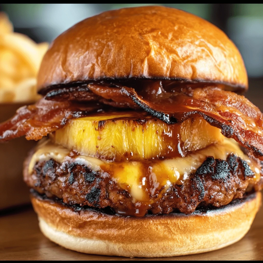 Start with the bottom bun and layer in this order for optimal texture: patty, melted cheese, turkey bacon, roasted pineapple, and extra BBQ sauce. Optional toppings like lettuce, onions, or jalapeños can add bite and crunch. Follow this Pinterest board of burger assembly tips for layout inspiration.