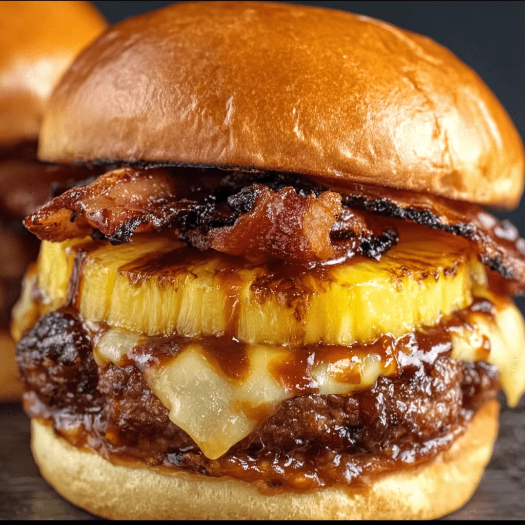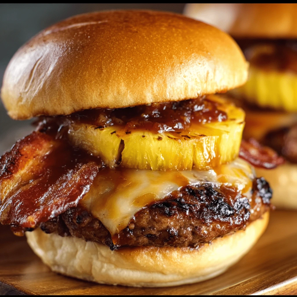 Top with a slice of crispy turkey bacon, a caramelized pineapple ring, and a drizzle of BBQ sauce.